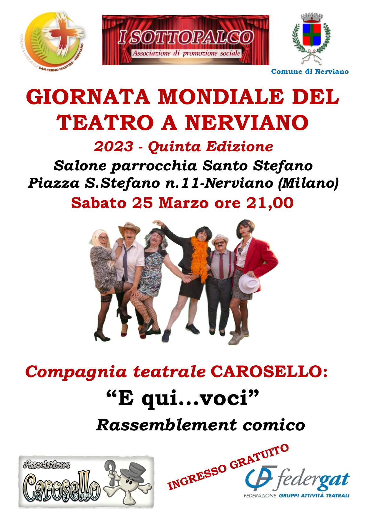 Sabato 25 marzo alle ore 21, nel salone della Parrocchia S.Stefano di Nerviano, la Compagnia Carosello metterà in scena “E qui..voci”, un rassemblement comico.