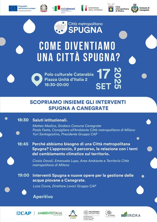 Il progetto “Città metropolitana Spugna” sarà protagonista a Canegrate durante un incontro pubblico aperto alla cittadinanza. Lunedì 17 settembre, dalle 18:30 alle 20:00, al Polo culturale Catarabia in piazza Unità d’Italia 2, si terrà una serata informativa per conoscere gli interventi previsti sul territorio comunale nell’ambito del programma finanziato dall’Unione Europea. Il progetto “Spugna” ha come obiettivo la creazione di città capaci di assorbire e gestire in modo sostenibile l’acqua piovana, per affrontare con strumenti concreti le sfide del cambiamento climatico. A Canegrate si parlerà di come l’approccio progettuale può trasformare gli spazi urbani, rendendoli più resilienti e adattabili alle piogge intense, sempre più frequenti. Durante l’incontro verranno illustrati i principi della “Città Spugna”, il percorso adottato e il legame con le tematiche ambientali più attuali. Interverranno esperti e tecnici del settore, insieme agli amministratori locali.