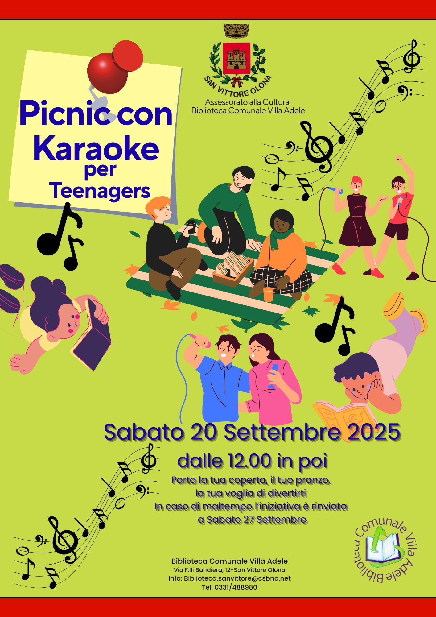 Sempre sabato 20, dalle 12 in poi, torna il “Picnic con Karaoke”, rivolto a ragazze e ragazzi della scuola secondaria di primo grado. Basterà portare una coperta, il pranzo al sacco e un po’ di coraggio per esibirsi con il microfono sul prato della biblioteca. In caso di maltempo, l’iniziativa sarà posticipata a sabato 27. Qui la locandina informativa
