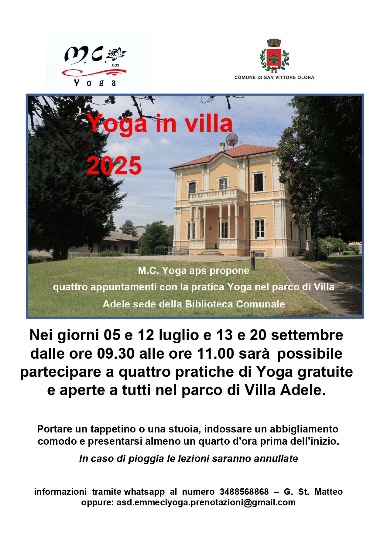 Giovedì 18 settembre alle 21 è in programma l’ultimo incontro stagionale del Gruppo di Lettura, con il romanzo “Gli occhi di Monna Lisa”. Durante la serata verranno presentate le letture scelte per il nuovo ciclo 2025-2026. Sabato 20 settembre alle 9.30 si terrà l’ultimo appuntamento di “Yoga in Villa”, attività gratuita promossa con l’associazione M.C. Yoga. Un’ora di pratica all’aria aperta, aperta a tutti, senza necessità di prenotazione. Qui tutte le info