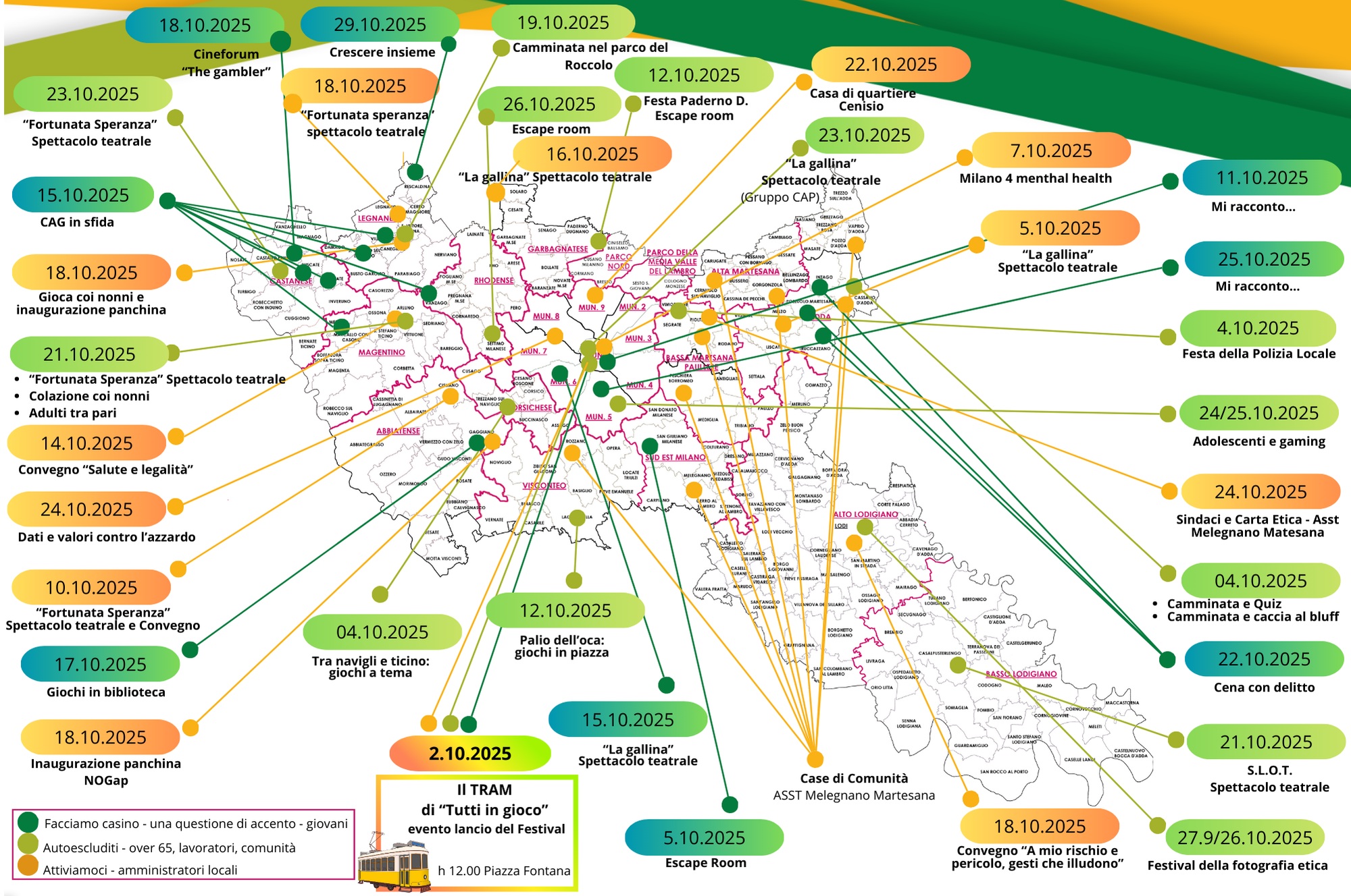 “Tutti in Gioco” prende il via simbolicamente proprio a Milano, cuore istituzionale e operativo del progetto. Mercoledì 2 ottobre, dalle 10.30 alle 13.30, si terrà l’evento di lancio sul tram brandizzato che attraverserà il centro cittadino, con partenza da piazza Fontana: un’iniziativa pensata per portare il messaggio del festival direttamente tra le persone. Durante il mese, Milano ospiterà anche momenti di approfondimento e confronto. Tra questi, il 5 ottobre dalle 17 alle 19 alla Casa dei Diritti (via De Amicis 10) si svolgerà l’incontro “Mental Health. A mio rischio e rischio”, rivolto in particolare ai giovani. Il 25 ottobre, alle 15, è in programma un incontro dal titolo “Mi racconto”, nella sede di Croce Rossa Milano in via Barrili 17, per ascoltare esperienze dirette legate al gioco d’azzardo. CLICCA QUI PER TUTTE LE INFO