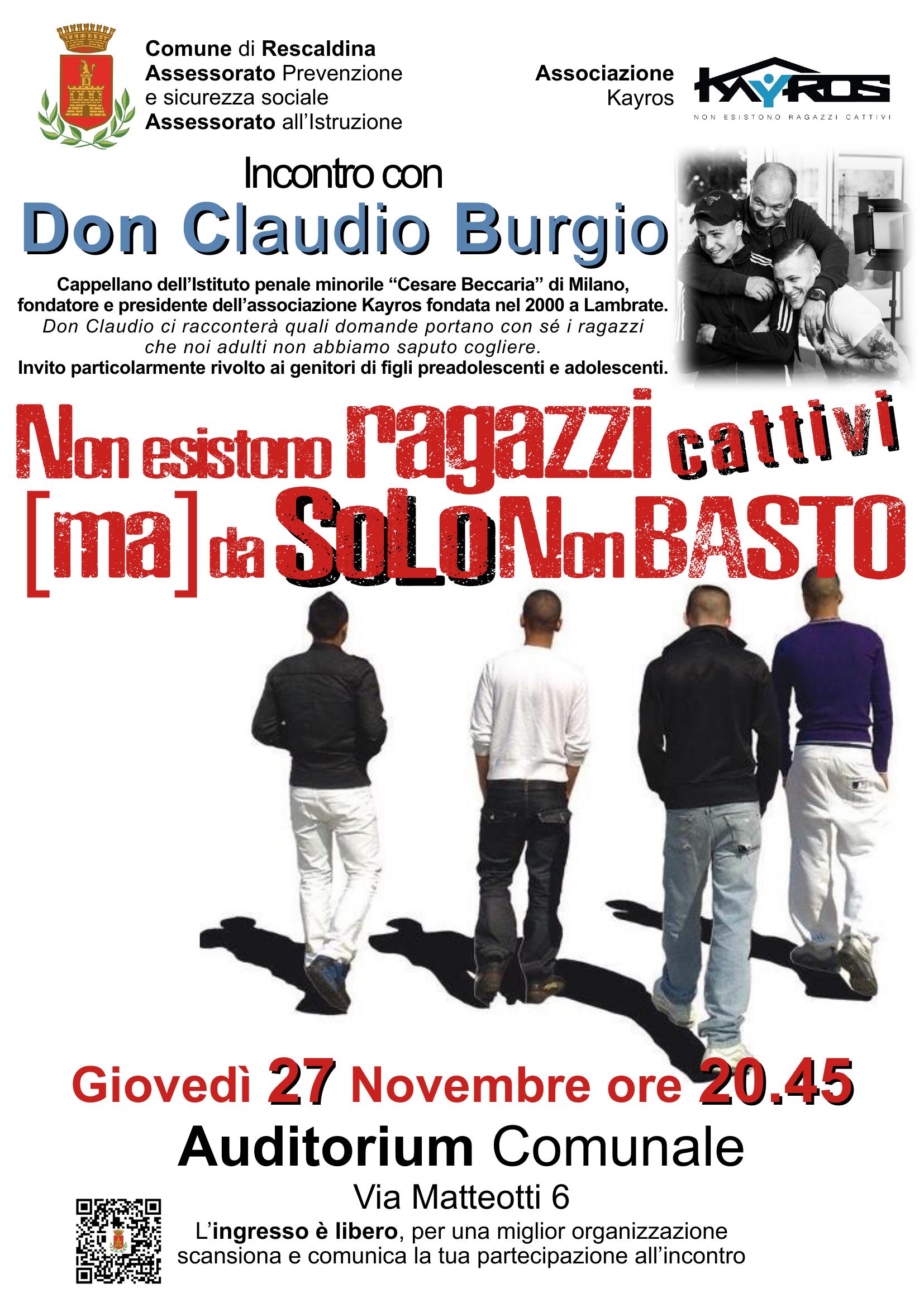 Un incontro aperto alla cittadinanza con Don Claudio Burgio, cappellano dell’Istituto penale minorile “Cesare Beccaria” di Milano, è in programma giovedì 27 novembre alle 20.45 all’auditorium comunale di via Matteotti 6 a Rescaldina. L’iniziativa rientra nelle attività promosse dall’amministrazione comunale per sensibilizzare sul tema dell’ascolto e del disagio giovanile. L’evento, dal titolo “Nonesistonoragazzi [ma]daSoLoNonBASTO”, è organizzato congiuntamente dall’assessorato alla prevenzione e sicurezza sociale e dall’assessorato all’istruzione del Comune di Rescaldina, in collaborazione con l’associazione Kayros. Ospite della serata sarà Don Claudio Burgio, fondatore e presidente dell’associazione Kayros, nata nel 2000 a Lambrate e da anni impegnata nell’accoglienza di minori in situazioni difficili.