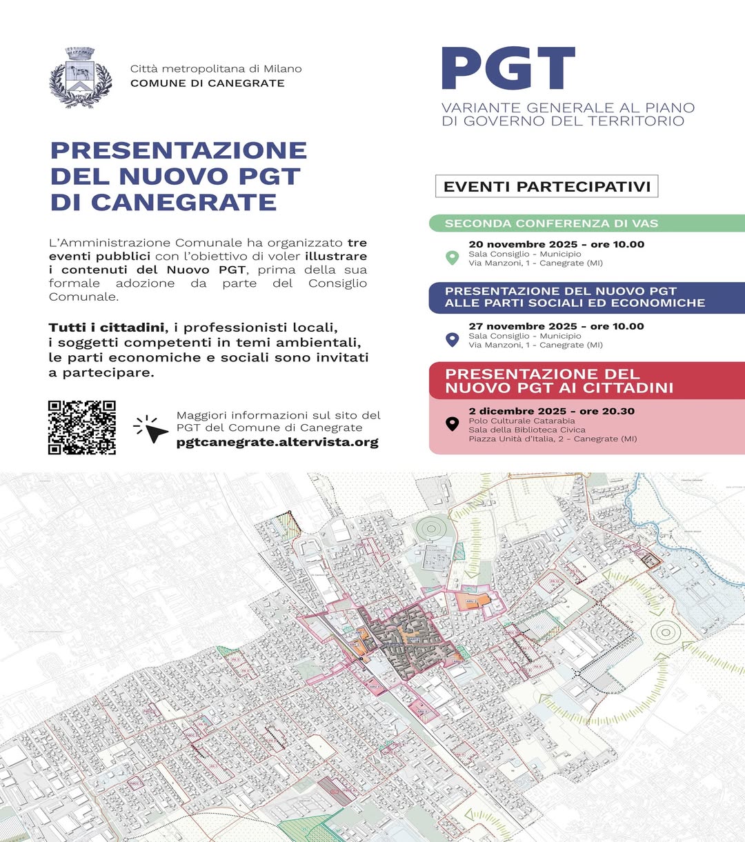 L’Amministrazione comunale di Canegrate organizza tre incontri pubblici per presentare il nuovo PGT, prima della sua formale adozione da parte del Consiglio comunale. Gli appuntamenti sono aperti alla cittadinanza, ai professionisti locali e ai soggetti attivi nei settori ambientali, economici e sociali. Si tratta di eventi partecipativi promossi per illustrare la Variante Generale al Piano di Governo del Territorio del Comune di Canegrate. L’obiettivo è condividere in modo trasparente i contenuti del nuovo PGT, raccogliere osservazioni e coinvolgere la comunità prima dell’approvazione ufficiale.