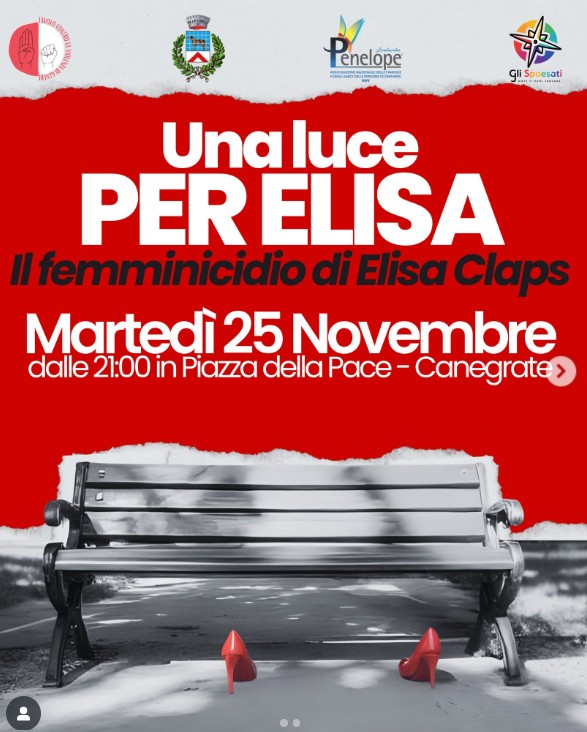 Una serata dedicata alla memoria di Elisa Claps e a tutte le donne vittime di femminicidio si terrà martedì 25 novembre in piazza della Pace a Canegrate. L’evento, dal titolo Una luce per Elisa, inizierà alle 21 ed è promosso dal Tavolo Antiviolenza di Canegrate con la partecipazione delle associazioni Penelope Lombardia e Gli Spaesati, con il patrocinio del Comune. Nel corso della serata sarà inaugurata una nuova panchina rossa, simbolo della lotta contro la violenza di genere. L’iniziativa intende essere un momento di comunità, ascolto e testimonianza, con l’obiettivo di mantenere viva la memoria di chi non ha più voce e promuovere consapevolezza e impegno collettivo.