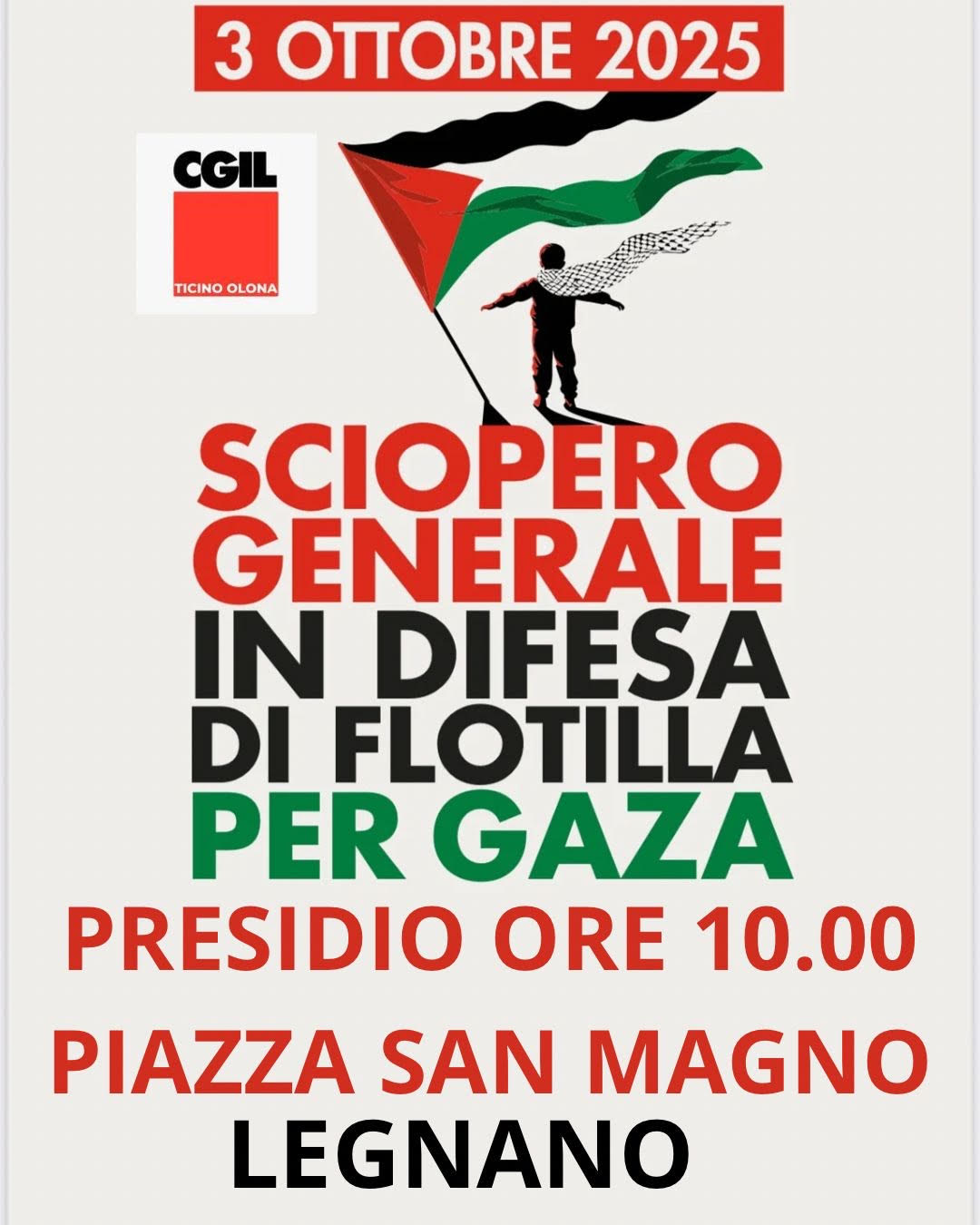 La Global Sumud Flotilla, impegnata in una missione civile e pacifica per portare aiuti umanitari e aprire un corridoio permanente verso Gaza, è stata abbordata e aggredita dalla Marina israeliana, che ha fermato le imbarcazioni in acque internazionali. Il sindacato ha deciso di indire lo sciopero proprio a seguito del blocco delle navi. Secondo Mario Principe segretario della Cgil Ticino Olona, si tratta di «un fatto di gravità estrema» che non solo rappresenta un attacco all’incolumità di lavoratori e volontari imbarcati, ma costituisce anche «un colpo inferto all’ordine costituzionale stesso» e un impedimento ad azioni di solidarietà nei confronti della popolazione palestinese. Il sindacato accusa inoltre il governo italiano di aver «abbandonato lavoratrici e lavoratori italiani in acque internazionali, violando i principi costituzionali», aggravando così la gravità dell’accaduto.