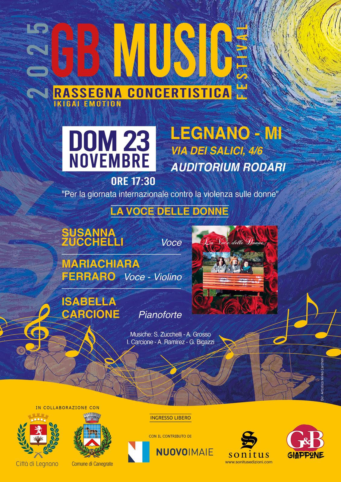 Un appuntamento musicale dedicato alla Giornata internazionale contro la violenza sulle donne si terrà domenica 23 novembre alle 17.30 all’Auditorium Rodari di Legnano, in via dei Salici 4/6. L’evento, intitolato La voce delle donne, fa parte del GB Music Festival – Rassegna concertistica Ikigai Emotion. Il concerto vedrà protagoniste Susanna Zucchelli alla voce, Mariachiara Ferraro voce e violino, e Isabella Carcione al pianoforte. In programma musiche composte dalle stesse artiste insieme ad A. Grosso, A. Ramírez e G. Bigazzi. La rassegna è organizzata con la collaborazione della Città di Legnano e del Comune di Canegrate, e con il contributo di Nuovo Imaie, Sonitus Edizioni e G&B Giappone. L’iniziativa si inserisce nel calendario di eventi dedicati al contrasto alla violenza di genere, con l’obiettivo di dare spazio e ascolto alla sensibilità femminile attraverso l’arte e la musica.