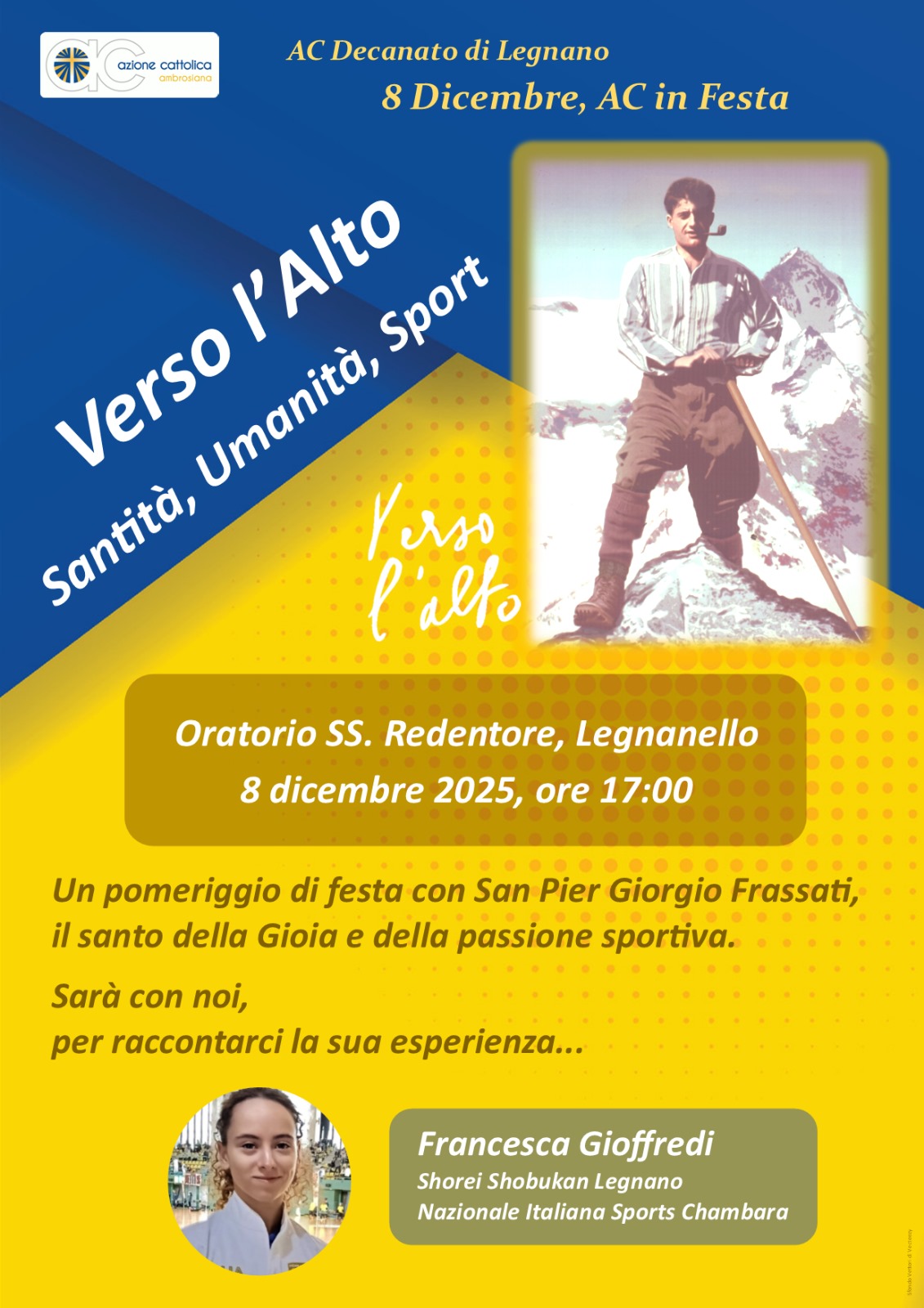 Domenica 8 dicembre la festa dell’adesione si svolgerà nella comunità del SS. Redentore, a Legnanello. Alle 10, durante la celebrazione eucaristica, è prevista la benedizione simbolica delle tessere di Azione Cattolica. Il pomeriggio proseguirà alle 17 con un momento comunitario intitolato “Verso l’Alto”, nello spirito di san Pier Giorgio Frassati. Nel corso della giornata interverrà anche Francesca Gioffredi, giovane atleta legnanese, che porterà la propria testimonianza di impegno sportivo come percorso di crescita e dedizione, in parallelo con il cammino di fede promosso dall’associazione.