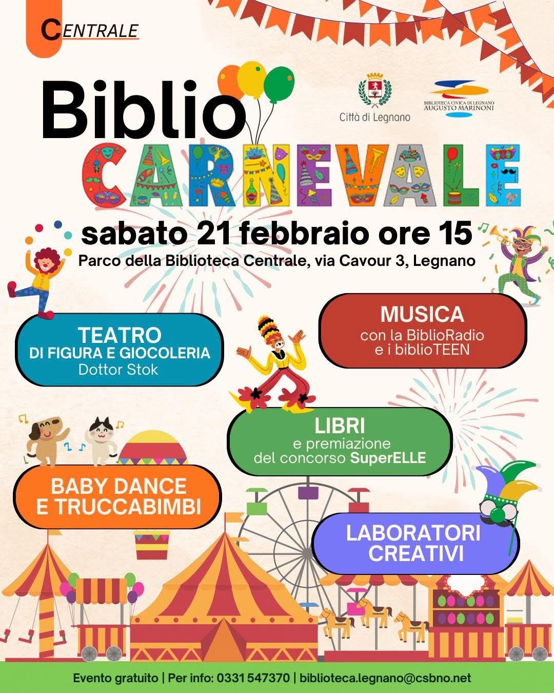 Biblio Carnevale torna sabato 21 febbraio alle 15 al parco della biblioteca centrale in via Cavour 3 a Legnano. L’iniziativa, promossa dalla Città di Legnano e dalla Biblioteca civica Augusto Marinoni, propone un pomeriggio di attività dedicate a bambini e famiglie. Il programma del Biblio Carnevale prevede teatro di figura e giocoleria con Dottor Stok. Spazio anche alla musica con la BiblioRadio e i biblioTEEN. Durante il pomeriggio sono in calendario momenti dedicati ai libri con la premiazione del concorso SuperELLE. Non mancheranno baby dance e truccabimbi, insieme a laboratori creativi pensati per coinvolgere i più piccoli.