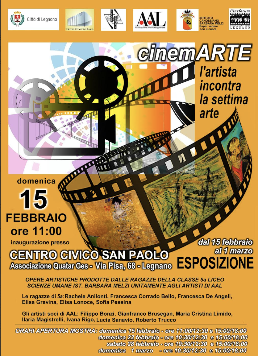 La mostra “cinemArte” nata dal progetto condiviso tra l’Associazione Artistica Legnanese (AAL), il Cineforum Marco Pensotti Bruni e le studentesse della quinta Liceo delle Scienze Umane dell’Istituto Barbara Melzi torna ora alla cittadinanza. Le opere saranno infatti allestite nel nuovo spazio del Centro Civico San Paolo, offrendo così a un pubblico più ampio la possibilità di conoscere e apprezzare il lavoro svolto dalle giovani protagoniste. La mostra sarà inaugurata il 15 febbraio alle 11 e rimarrà esposta fino 1 marzo.