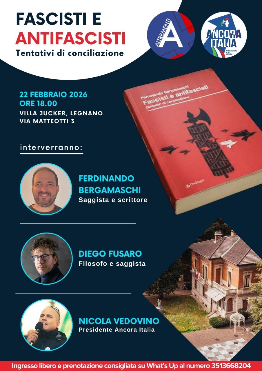 Domenica 22 febbraio, alle 18:00, presso Villa Jucker a Legnano, si terrà un importante appuntamento culturale dedicato al tema della “conciliazione nazionale”. Nella sala della storica dimora si svolgerà un incontro di riflessione e confronto a partire dal saggio “Fascisti e Antifascisti, Tentativi di conciliazione” di Ferdinando Bergamaschi.