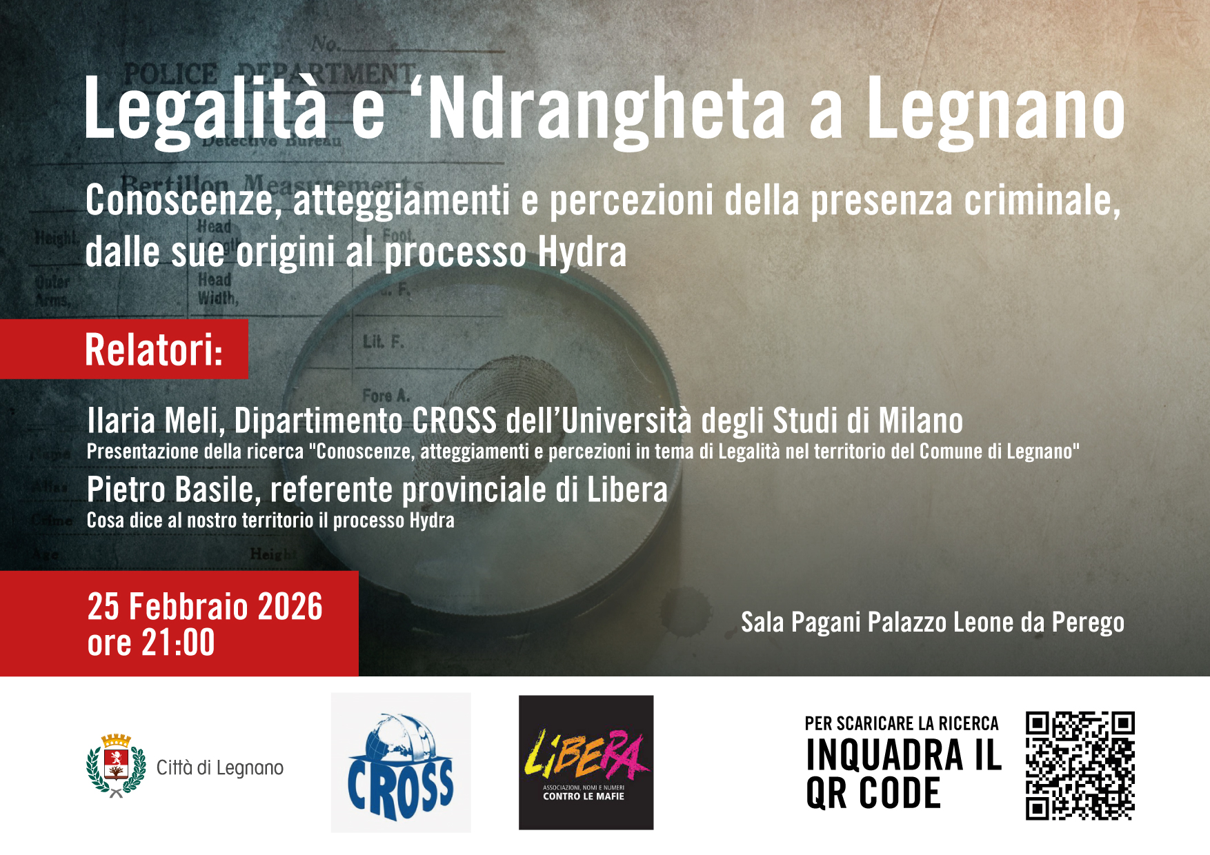 Un incontro sulla legalità si terrà il 25 febbraio alle 21 alla Sala Pagani di Palazzo Leone da Perego a Legnano. L’appuntamento, aperto alla cittadinanza, sarà dedicato al contrasto all’illegalità e all’analisi delle presenze mafiose in Lombardia e nel territorio legnanese, dalle origini fino al processo Hydra. L’obiettivo è creare consapevolezza sulle dinamiche delle presenze mafiose in Lombardia e nel territorio, favorendo una maggiore conoscenza dei fenomeni e degli strumenti di contrasto. L’incontro sulla legalità vedrà la partecipazione di Ilaria Meli, del Dipartimento CROSS dell’Università degli Studi di Milano. Durante la serata sarà presentata la ricerca dal titolo “Conoscenze, atteggiamenti e percezioni in tema di legalità nel territorio del Comune di Legnano”, uno studio dedicato all’analisi del rapporto tra cittadini e fenomeni legati alla legalità. Interverrà anche Pietro Basile, referente provinciale di Libera, con un approfondimento su “Cosa dice al nostro territorio il processo Hydra”. Il contributo offrirà una lettura del procedimento giudiziario e delle sue implicazioni per la realtà locale.