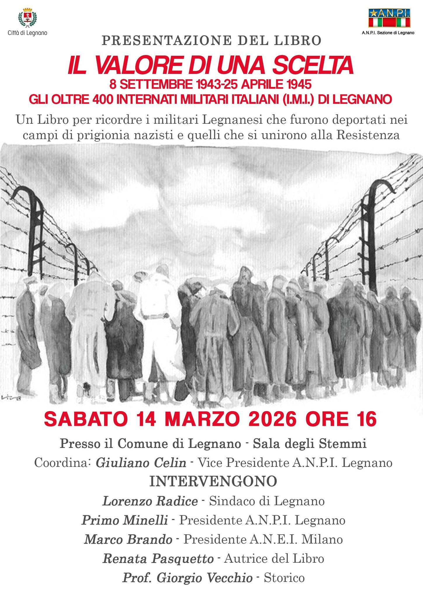 Sabato 14 marzo alle 16 la Sala Stemmi del Comune di Legnano ospiterà la presentazione del libro a cura di Renata Pasquetto: “Il valore di una scelta. 8 settembre 1943-25 aprile 1945. Gli oltre 400 Internati Militari Italiani (I.M.I.) di Legnano”. Un libro per ricordare i militari legnanesi che si unirono alla Resistenza e coloro che furono deportati nei campi di prigionia nazisti.