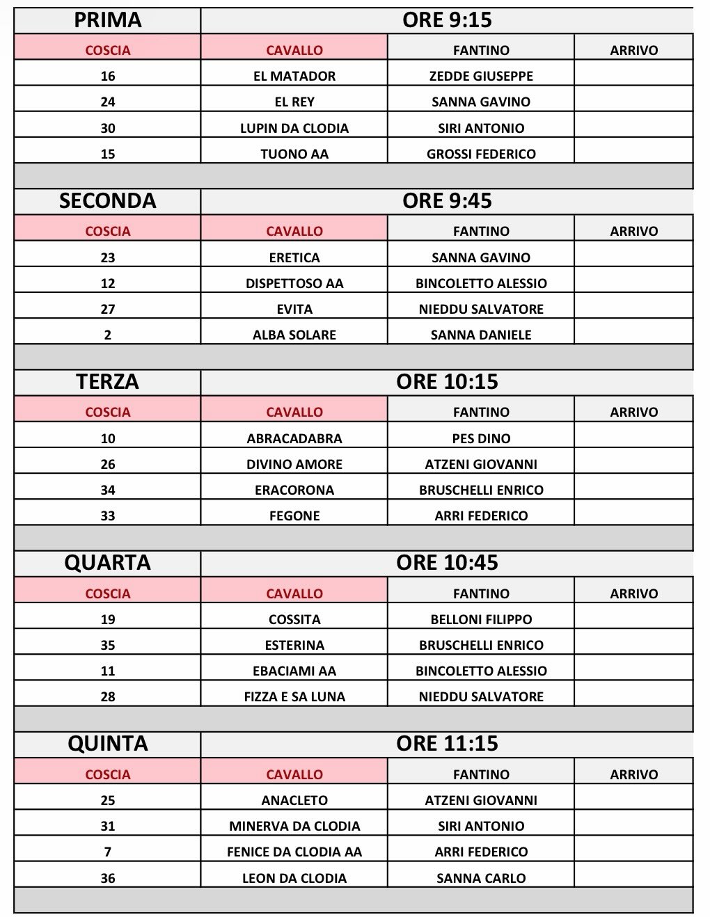 Dalle 9,15 diretta testuale delle corse. La prima riunione con 38 cavalli al canapo, suddivisi in 10 batterie, e tutti i fantini del prossimo Palio. Mossiere Gennaro Milone