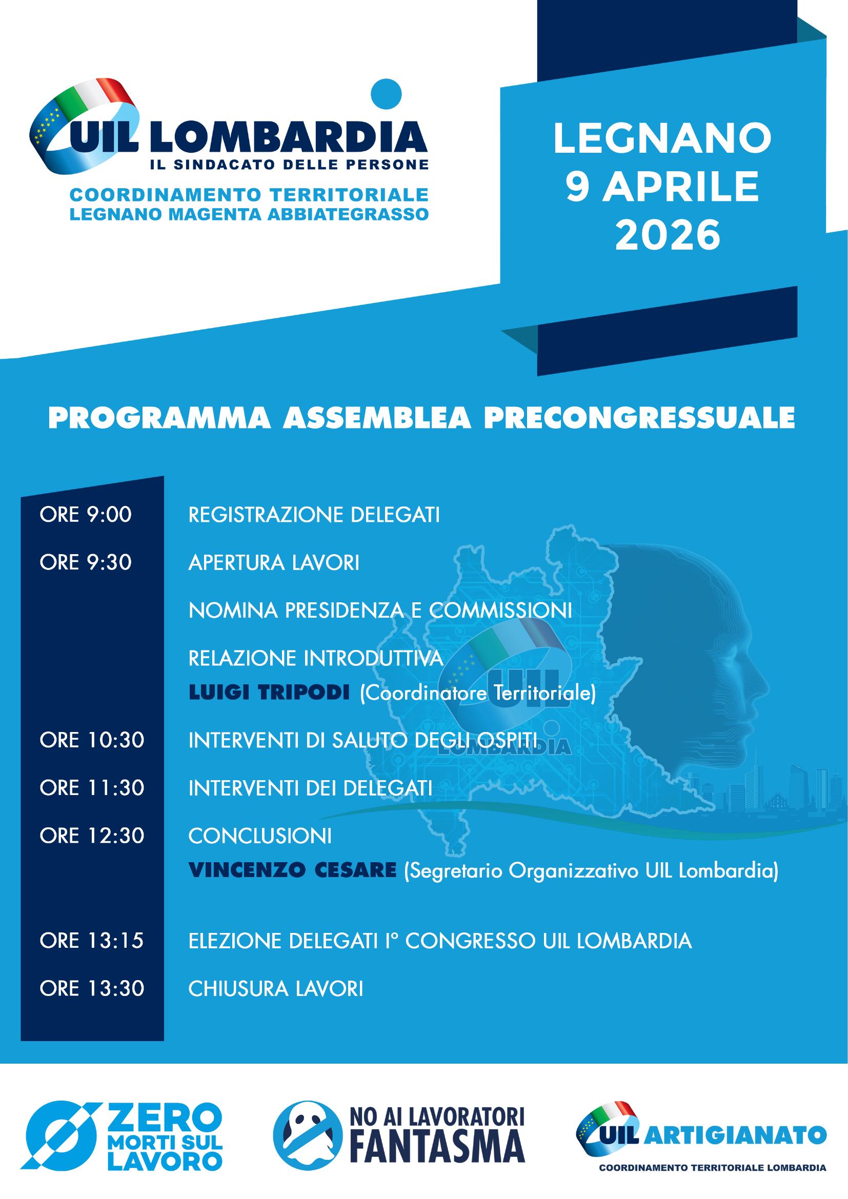 L’assemblea precongressuale UIL Lombardia si terrà a Legnano giovedì 9 aprile e coinvolgerà delegati e rappresentanti sindacali del coordinamento territoriale. L’iniziativa è promossa dalla UIL Lombardia attraverso il coordinamento territoriale Legnano Magenta Abbiategrasso. La giornata prevede l’apertura dei lavori dopo la registrazione dei delegati e la nomina della presidenza e delle commissioni.