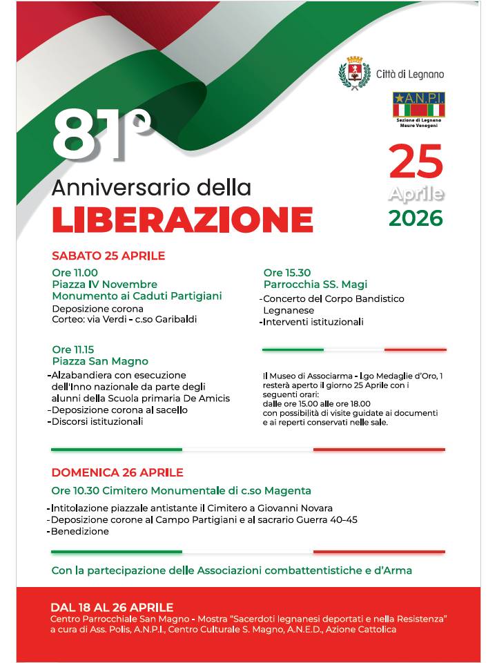 La giornata di sabato 25 aprile si aprirà alle ore 11 in piazza IV Novembre al monumento ai Caduti partigiani con la deposizione della corona. Seguirà il corteo lungo via Verdi e corso Garibaldi. Alle ore 11.15 in piazza San Magno è prevista l’alzabandiera con esecuzione dell’Inno nazionale da parte degli alunni della scuola primaria De Amicis. In programma anche la deposizione della corona al sacello e i discorsi istituzionali. Nel pomeriggio, alle ore 15.30 alla parrocchia Santi Magi, si terrà il concerto del Corpo bandistico legnanese, seguito dagli interventi istituzionali.