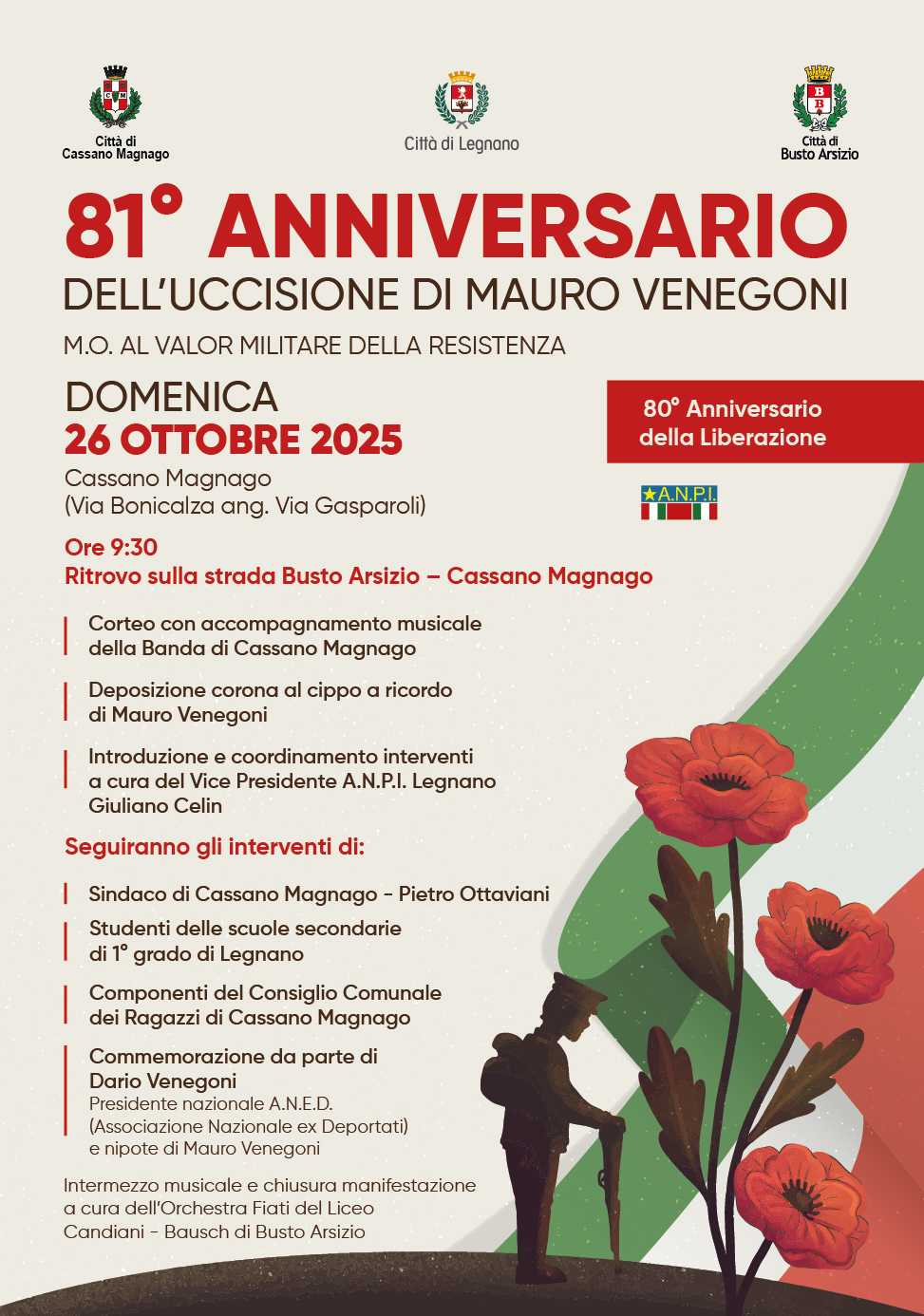 È in programma domenica 26 ottobre alle 9.30 a Cassano Magnago, la commemorazione dell’81° anniversario dell’uccisione del partigiano Mauro Venegoni avvenuta il 31 ottobre del 1944. La cerimonia si svolgerà nei pressi del cippo a lui dedicato lungo la strada Busto Arsizio-Cassano Magnago (via Bonicalza ang. Via Gasparoli), proprio dove il suo corpo era stato sepolto dopo l’assassinio.