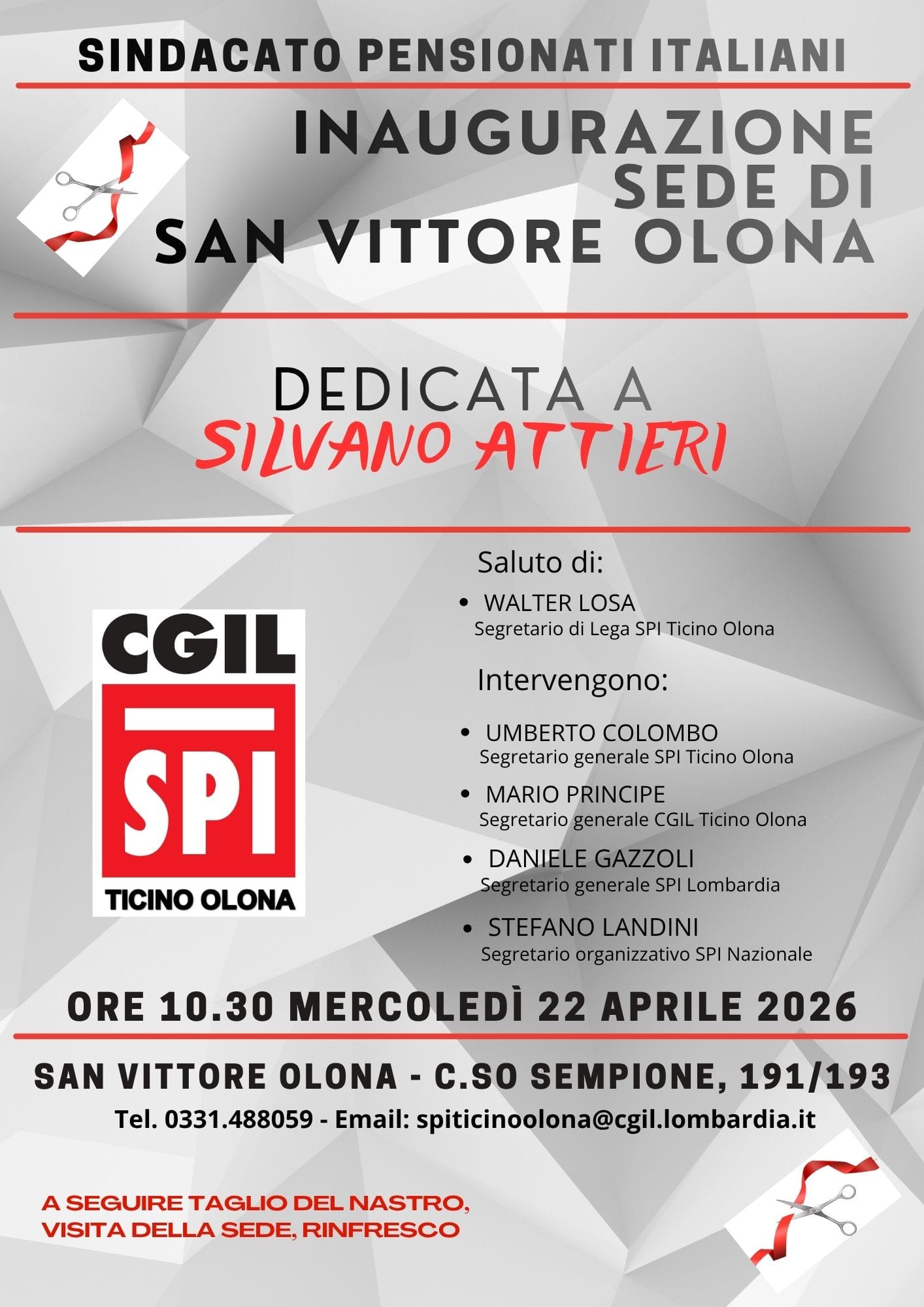 La SPI-CGIL inaugurerà mercoledì 22 aprile una sede a San Vittore Olona dedicata a Silvano Attieri. L’appuntamento è in programma alle 10.30 in corso Sempione. L’apertura di questo nuovo sportello territoriale è promossa dal Sindacato Pensionati Italiani. La mattinata prevede i saluti istituzionali di Walter Losa, segretario di lega SPI Ticino Olona. Sono inoltre previsti gli interventi di Umberto Colombo, segretario generale SPI Ticino Olona, Mario Principe, segretario generale CGIL Ticino Olona, Daniele Gazzoli, segretario generale SPI Lombardia, e Stefano Landini, segretario organizzativo SPI nazionale.