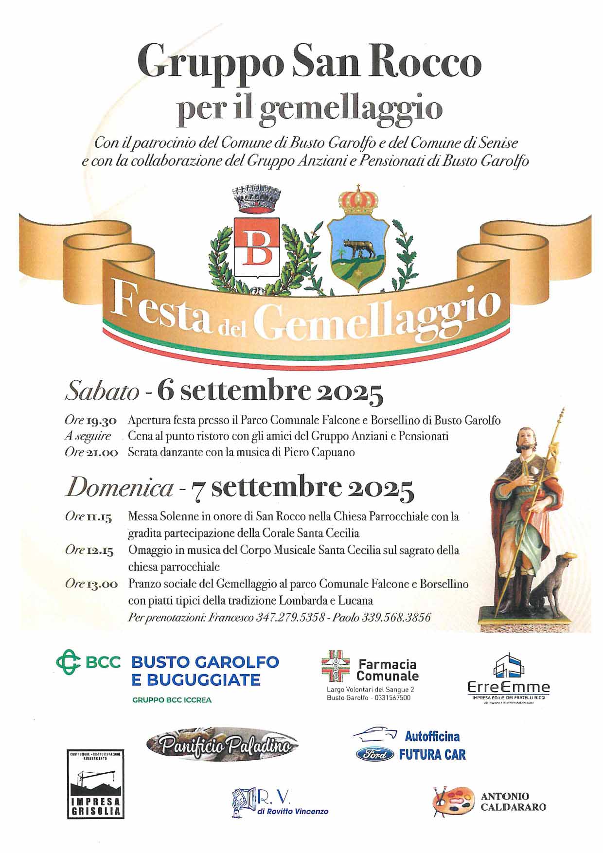 Le celebrazioni del gemellaggio tra Busto Garolfo e Senise prenderanno il via sabato 6 settembre alle 19.30, al Parco Comunale Falcone e Borsellino, con l’apertura ufficiale. Subito dopo, sarà possibile cenare al punto ristoro insieme agli amici del Gruppo Anziani e Pensionati. La serata proseguirà con musica e divertimento: dalle ore 21.00 spazio alla danza con l’accompagnamento musicale di Piero Capuano. Domenica 7 settembre, il momento più solenne sarà la Messa in onore di San Rocco nella chiesa parrocchiale, alle 11.15, accompagnata dalla Corale di Santa Cecilia. Sul sagrato seguirà l’omaggio musicale del Corpo Musicale di Santa Cecilia. La giornata continuerà al Parco Falcone e Borsellino con il pranzo sociale delle 13, che proporrà piatti tipici lombardi e lucani, per celebrare ancora una volta l’unione di due terre attraverso la cucina. Per partecipare al pranzo è richiesta la prenotazione, contattando Francesco al numero 347.279.5358 oppure Paolo al 339.568.3856.