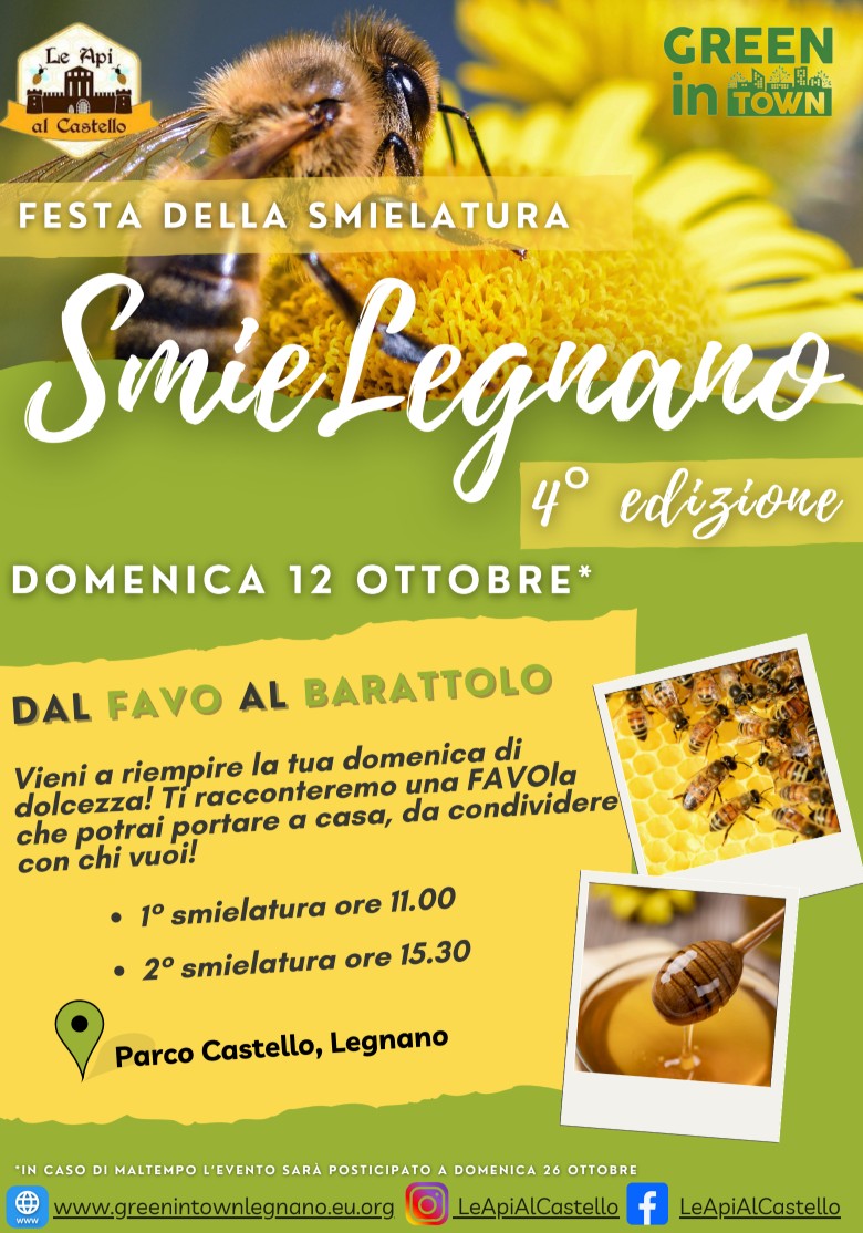 “SmieLegnano – Festa della Smielatura”, giunta alla sua 4a edizione, torna Parco Castello di Legnano. L’evento organizzato dall’associazione Green in Town ODV, nell’ambito del progetto “Le Api al Castello” si terrà domenica 12 ottobre. «L’iniziativa offre a grandi e piccini la possibilità di vivere in prima persona l’esperienza “Dal Favo al Barattolo”, assistendo in diretta all’affascinante processo di estrazione del miele – affermano gli organizzatori -. La giornata prevede due sessioni dimostrative di smielatura, durante le quali gli apicoltori del progetto “Le Api al Castello” mostreranno come il miele viene separato dai favi, raccontando l’importanza di questo processo e il ruolo cruciale delle api per il nostro ecosistema».