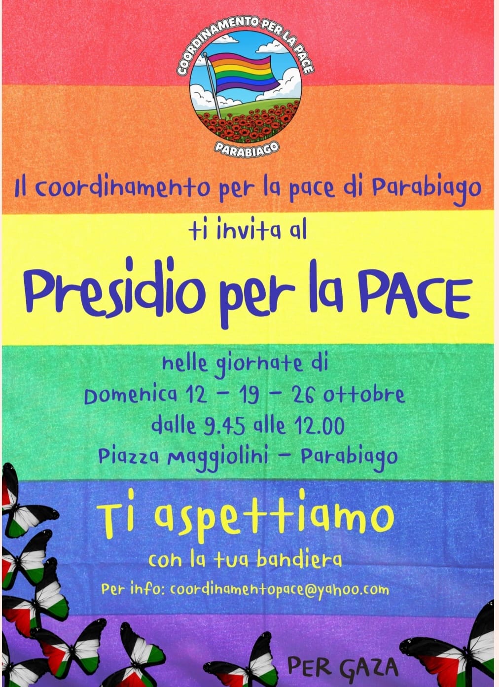 Parabiago scende in piazza per la pace. Il Coordinamento per la Pace di Parabiago ha organizzato un presidio per la Pace che si articolerà in tre momenti: domenica 12, 19 e 26 ottobre in piazza Maggiolini, dalle 9.45 alle 12.00.
