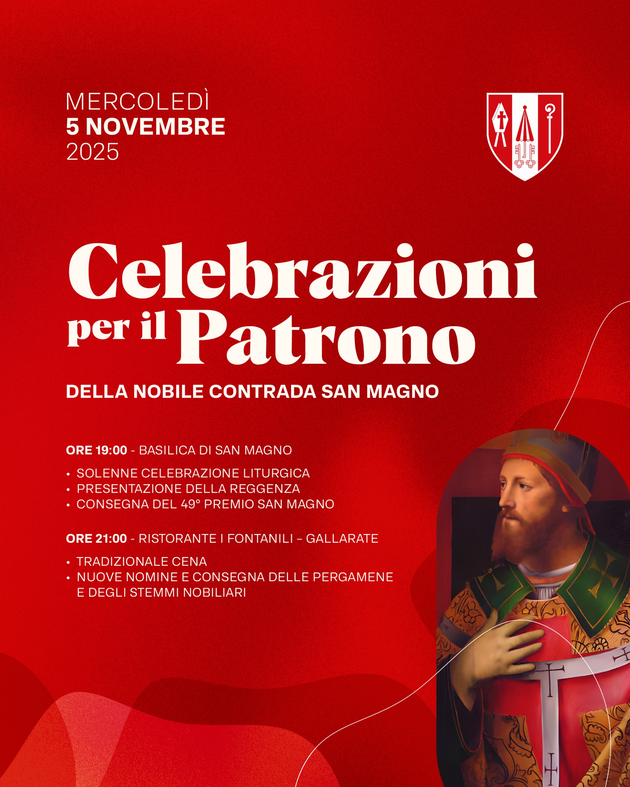 Nel quadro delle manifestazioni che rinnovano il secolare omaggio che la Contrada rivolge al Vescovo San Magno, sabato 1 novembre e domenica 2 novembre, ci sarà, come da tradizione, il Mercato del Vescovo con la mostra-mercato di prodotti tipici e di artigianato selezionato e la postazione gastronomica rossobiancorossa. Qui tutte le info Lunedì 3 novembre alle 19:00, al maniero di Contrada, si terrà la presentazione ufficiale del calendario 2026. Durante la serata verrà raccontato il progetto, con la partecipazione di tutti coloro che vi hanno collaborato. Qui tutte le info