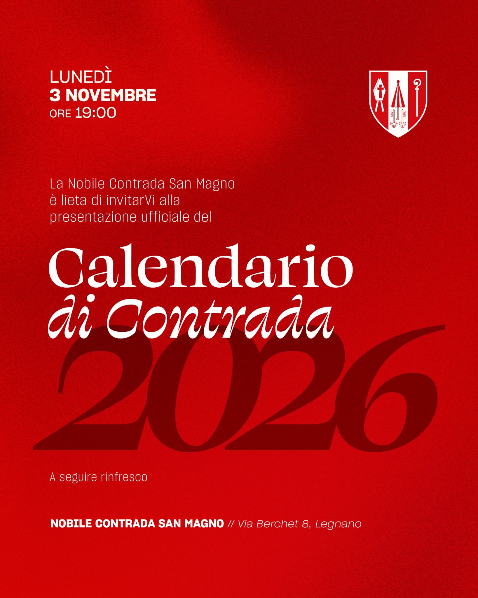 Nel quadro delle manifestazioni che rinnovano il secolare omaggio che la Contrada rivolge al Vescovo San Magno, sabato 1 novembre e domenica 2 novembre, ci sarà, come da tradizione, il Mercato del Vescovo con la mostra-mercato di prodotti tipici e di artigianato selezionato e la postazione gastronomica rossobiancorossa. Qui tutte le info Lunedì 3 novembre alle 19:00, al maniero di Contrada, si terrà la presentazione ufficiale del calendario 2026. Durante la serata verrà raccontato il progetto, con la partecipazione di tutti coloro che vi hanno collaborato. Qui tutte le info