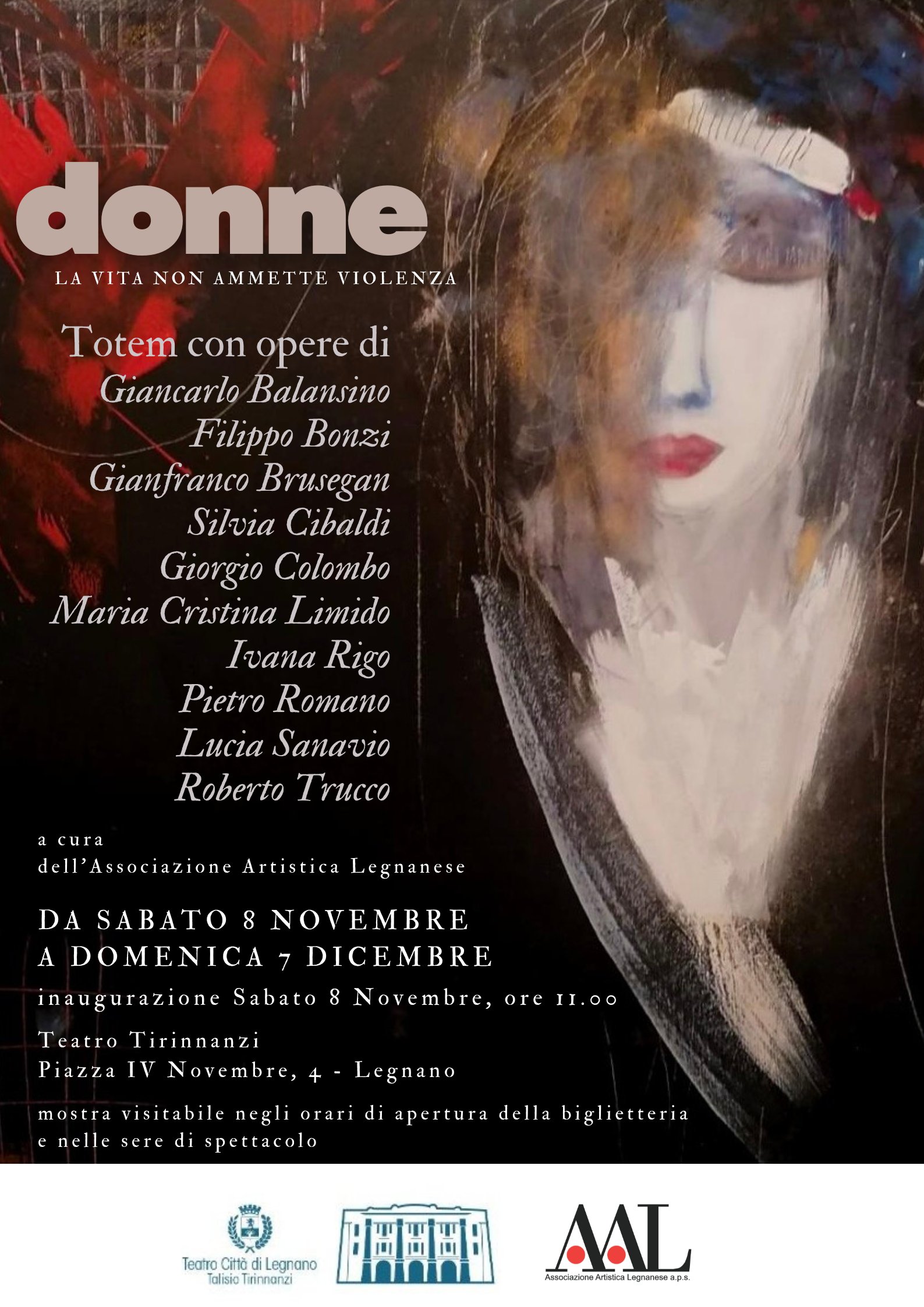 Sabato 8 Novembre, alle 11, verrà inaugurata la prima mostra nel foyer del Teatro Città di Legnano Talisio Tirinnanzi. In occasione della “Giornata Internazionale per l’eliminazione della violenza contro le donne” verranno esposte opere “a tema”. E’ nata così la mostra “Donne – la vita non ammette violenza”, visitabile dall’8 Novembre al 7 Dicembre, negli orari di apertura della biglietteria (giovedì e venerdì dalle 16.00 alle 19.00 – sabato dalle 10 alle 12 e nelle serate di spettacolo). Gli artisti coinvolti sono: Giancarlo Balansino, Filippo Bonzi, Gianfranco Brusegan, Silvia Cibaldi, Giorgio Colombo, Maria Cristina Limido, Ivana Rigo, Pietro Romano, Lucia Sanavio e Roberto Trucco.