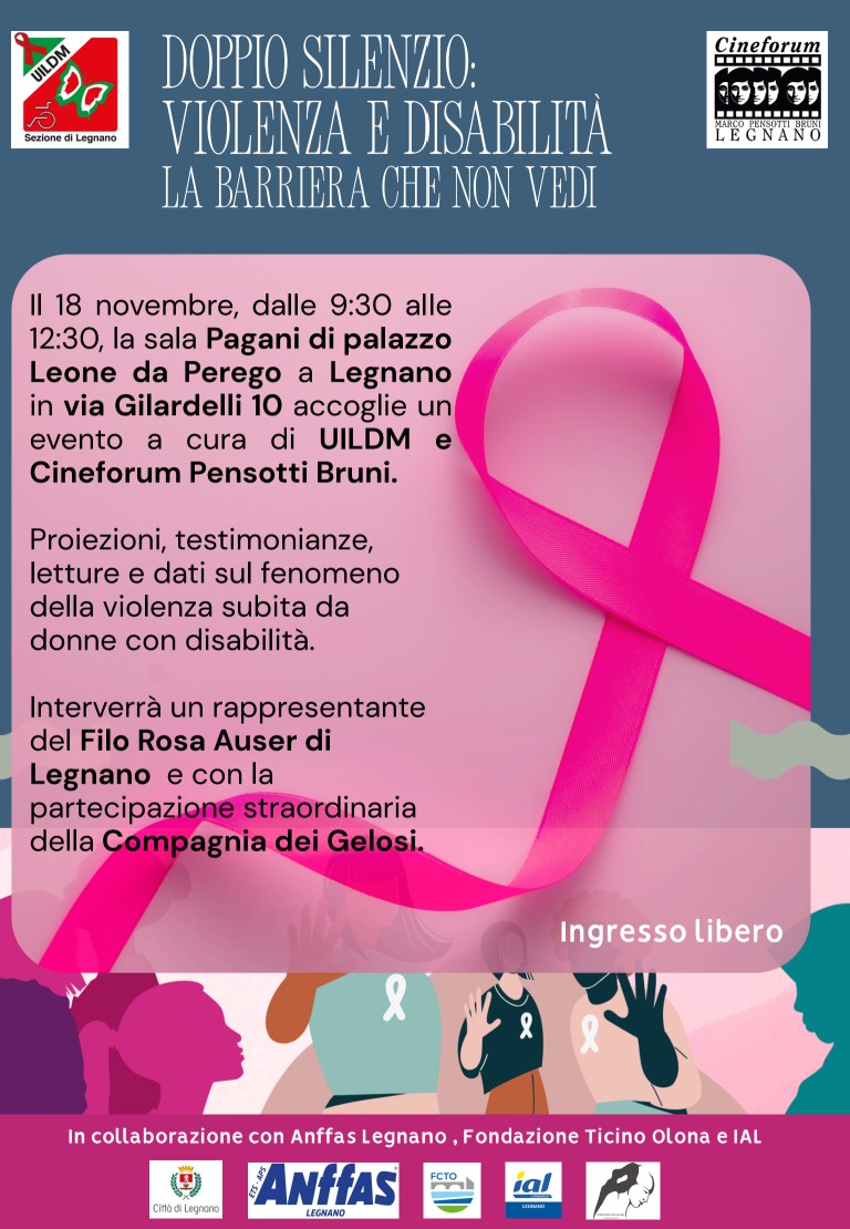 Un incontro pubblico per accendere i riflettori su una forma di violenza spesso invisibile. Martedì 18 novembre, dalle 9.30 alle 12.30, la sala Pagani di palazzo Leone da Perego in via Gilardelli 10 a Legnano ospita l’evento “Doppio silenzio: violenza e disabilità – La barriera che non vedi”, promosso da UILDM Legnano in collaborazione con Cineforum Pensotti Bruni. L’iniziativa propone una mattinata di proiezioni, testimonianze, letture e dati dedicati al tema della violenza subita da donne con disabilità. Il programma prevede l’intervento di un rappresentante del Filo Rosa Auser di Legnano e la partecipazione straordinaria della Compagnia dei Gelosi. L’evento è realizzato con il supporto di Anffas Legnano, Fondazione Ticino Olona e IAL Legnano, con il patrocinio del Comune di Legnano.