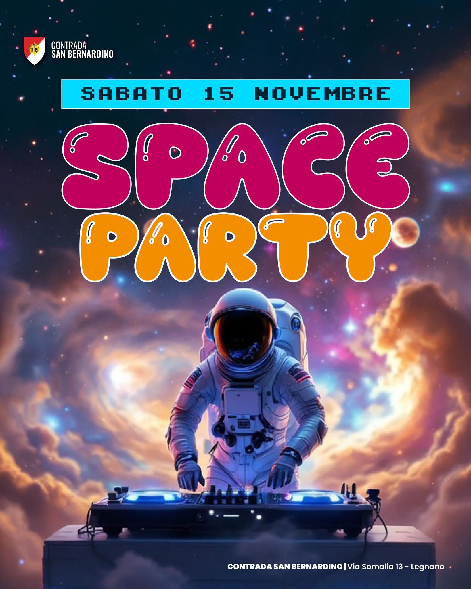 Una serata a tema galattico attende gli appassionati di festa e divertimento sabato 15 novembre. La Contrada San Bernardino organizza il “Space Party” nel Maniero di via Somalia 13, con inizio alle 21.30. Il “Space Party” è una festa a tema che invita i partecipanti a lasciarsi trasportare in un’atmosfera cosmica. La serata propone musica, travestimenti e intrattenimento a tema spaziale. L’invito della Contrada è chiaro: vestirsi da astronauti, alieni o con look ispirati all’universo per immergersi completamente nell’esperienza. L’evento si svolgerà nei locali del Maniero della Contrada, che per l’occasione sarà allestito con scenografie ispirate allo spazio. Il dress code prevede abbigliamento a tema spaziale. La serata è aperta a tutti coloro che desiderano partecipare, senza indicazioni su prenotazioni o costi d’ingresso.