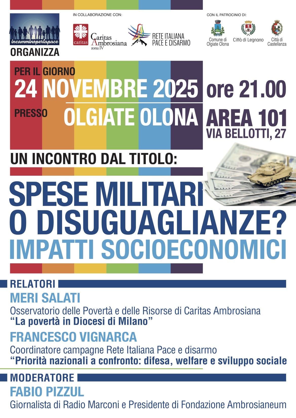 Al teatro Area 101, lunedì 24 novembre, con moderatore Fabio Pizzul e relatori Francesco Vignarca e Meri Salati. Incontro organizzato dal Tavolo In Cammino per la Pace
