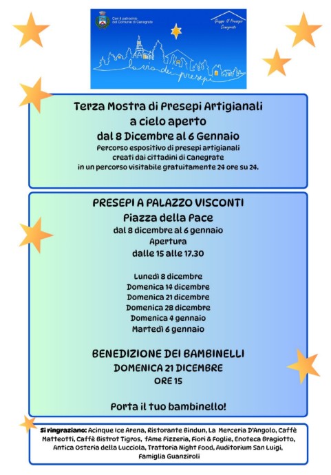 Domenica 21 dicembre alle ore 15, a Palazzo Visconti si terrà la Benedizione del Bambinello, seguita dall’esibizione del Corpo Musicale Cittadino. I partecipanti potranno portare il proprio bambinello da casa per la benedizione. La mostra al coperto sarà aperta dalle 15 alle 17.30 nei giorni: 8, 14, 21 e 28 dicembre, 4 e 6 gennaio. Tutti i presepi, sia all’aperto sia a Palazzo Visconti, potranno essere votati dal pubblico online sulla pagina Facebook del Gruppo o direttamente sul posto. I vincitori, scelti da voto popolare e giuria di qualità, saranno premiati domenica 11 gennaio alle ore 17 presso il Polo Culturale Catarabia.