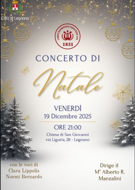 Il tradizionale Concerto di Natale si terrà venerdì 19 dicembre nella chiesa di San Giovanni, in via Liguria a Legnano. A partire dalle 21, il Corpo Bandistico Legnanese 1831 proporrà un repertorio dedicato alle festività, diretto dal maestro Alberto R. Manzalini. La serata musicale sarà arricchita dalla presenza delle voci di Clara Lippolis e Noemi Bernardo. Il concerto, promosso con il patrocinio della Città di Legnano, offrirà al pubblico brani legati alla tradizione natalizia, in un’atmosfera suggestiva nella cornice della chiesa di San Giovanni.