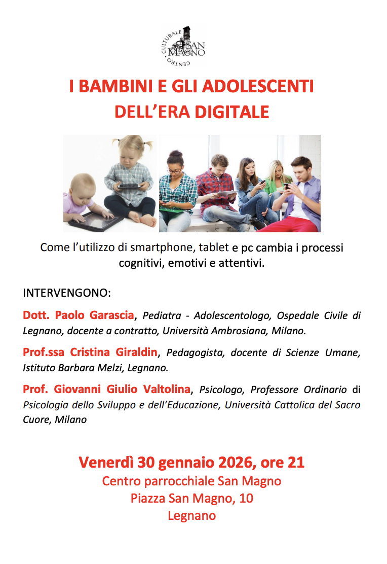 Nella settimana che la Chiesa ambrosiana dedica all’educazione, dal 21 al 31 gennaio, il Centro Culturale San Magno propone un momento di riflessione e approfondimento su un tema di grande attualità: “I bambini e gli adolescenti nell’era digitale”.