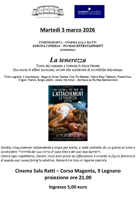 “La tenerezza”, distribuito da No.Mad Entertainment sarà proiettato a Legnano al Cinema Sala Ratti. L‘appuntamento è per le 21 di martedì 3 marzo e rientra nella rassegna Cineproposta. Il titolo originale del film “L’attachement”, diretto da Carine Tardieu è tratto dal romanzo “L’intimité” di Alice Ferney.