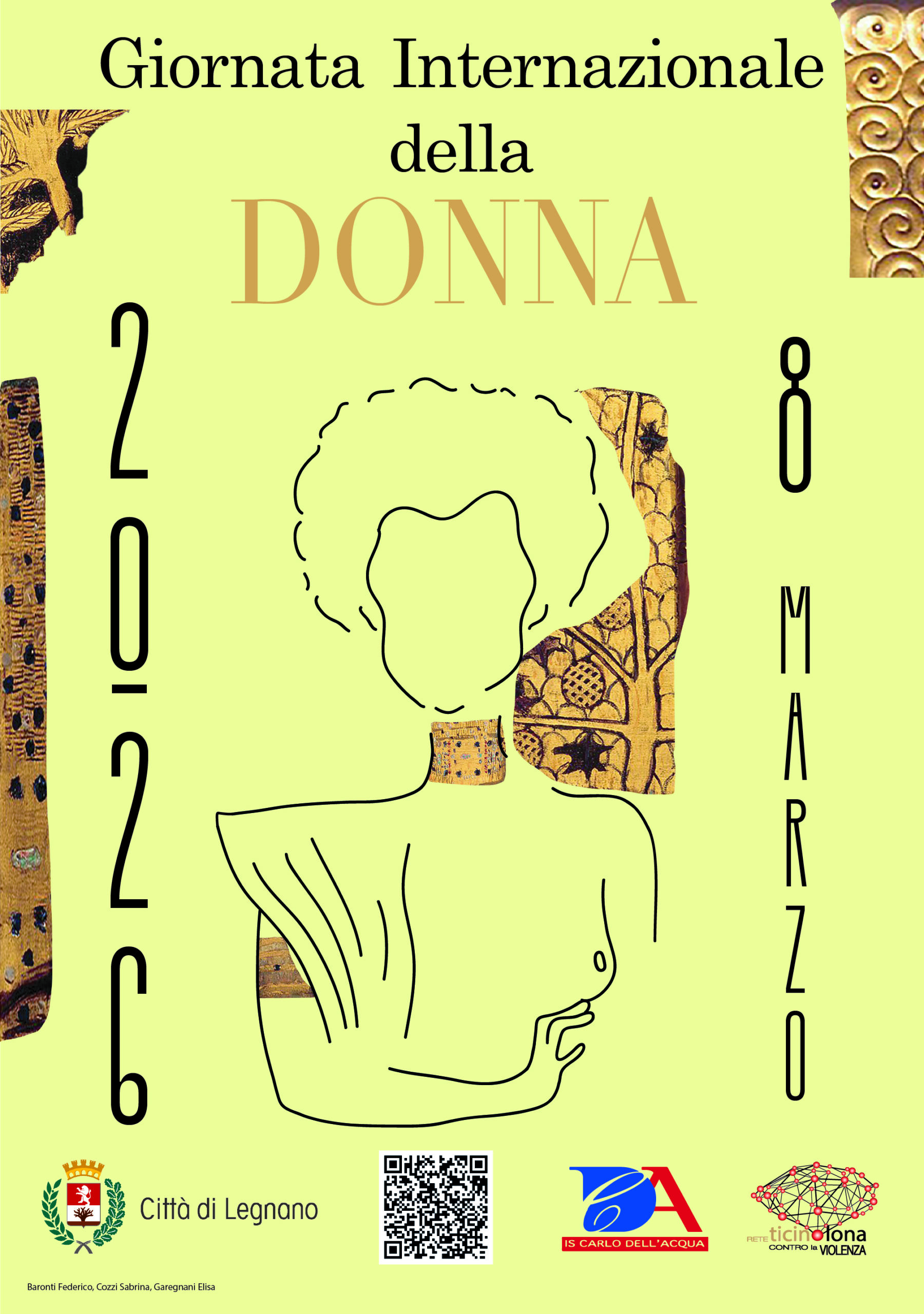 Come negli anni precedenti il manifesto della Giornata internazionale della Donna è il risultato di un concorso fra gli studenti del Liceo Artistico Carlo Dell’Acqua di Legnano, coordinati dai professori Drago e Alberti, ed è stato selezionato fra più elaborati da parte dell’amministrazione comunale. Il manifesto vincitore è quello realizzato da Federico Baronti, Sabrina Cozzi e Elisa Garegnani, studenti della classe 3°B indirizzo grafico, e ispirato alla “Giuditta” di Gustav Klimt.