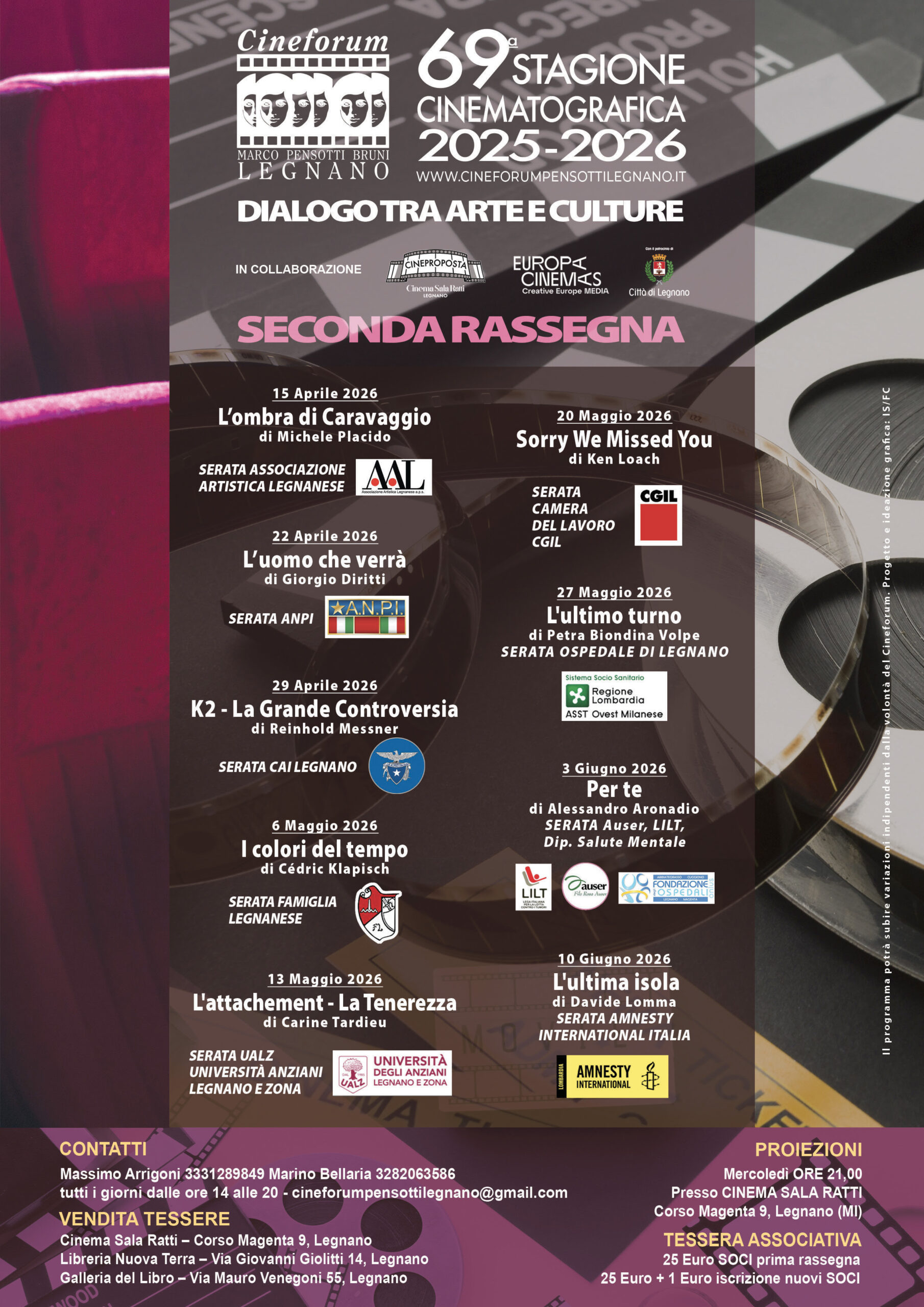 Il programma prevede nove film abbinati a serate tematiche curate insieme alle associazioni coinvolte. Si parte il 15 aprile con “L’ombra di Caravaggio” di Michele Placido, in collaborazione con l’Associazione Artistica Legnanese. Il 22 aprile sarà la volta de “L’uomo che verrà” di Giorgio Diritti con ANPI, mentre il 29 aprile verrà proiettato “K2 – La grande controversia” di Reinhold Messner con il CAI Legnano. A maggio sono in calendario “I colori del tempo” di Cédric Klapisch il 6 maggio con la Famiglia Legnanese e “L’attachement – La tenerezza” di Carine Tardieu il 13 maggio con UALZ. Il 20 maggio è prevista la proiezione di “Sorry We Missed You” di Ken Loach con CGIL. Gli ultimi appuntamenti saranno il 27 maggio con “L’ultimo turno” di Petra Biondina Volpe in collaborazione con l’Ospedale di Legnano, il 3 giugno con “Per te” di Alessandro Aronadio insieme a Filo Rosa Auser, LILT e Dipartimento Salute Mentale, e il 10 giugno con “L’ultima isola” di Davide Lomma con Amnesty International Italia.