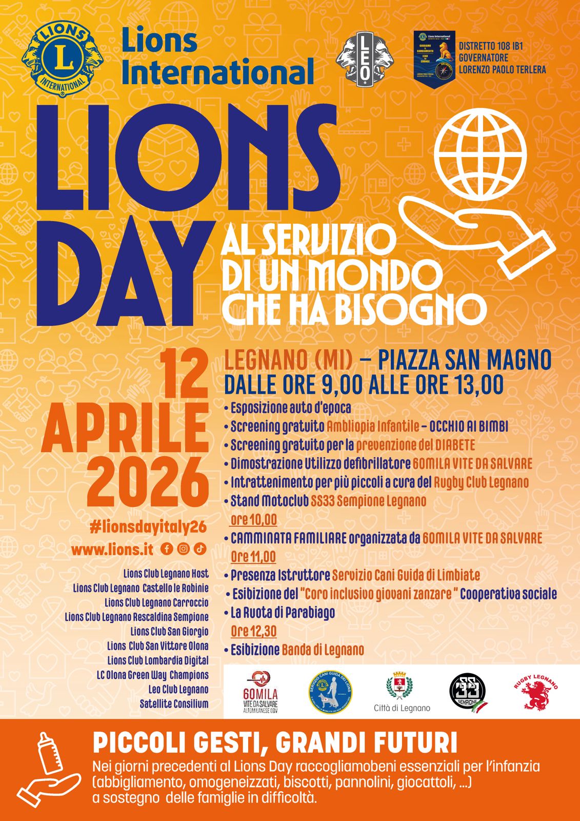 A completare la giornata, anche un’iniziativa solidale rivolta alle famiglie in difficoltà: nei giorni precedenti al Lions Day sarà infatti promossa una raccolta di beni essenziali per l’infanzia – tra cui abbigliamento, omogeneizzati, biscotti, pannolini e giocattoli – con l’obiettivo di offrire un aiuto concreto a chi ne ha più bisogno. Una giornata che unisce partecipazione, prevenzione e solidarietà, con una camminata che diventa occasione concreta per contribuire alla sicurezza e al benessere della comunità. La giornata a Legnano è stata organizzata dai Lions Club International della Zona B della Terza Circoscrizione Distretto 108 Ib1, di cui fanno parte: Lions Club Legnano Host, Lions Club Legnano Carroccio, Lions Club Legnano Castello le Robinie, Lions Club San Giorgio su Legnano, Lions Club Legnano Rescaldina Sempione, Lions Club San Vittore Olona, Lions Club Lombardia Digital L.D., Lions Club Olona Green Way Champions, Leo Club Legnano, Lions Club Satellite Consilium.