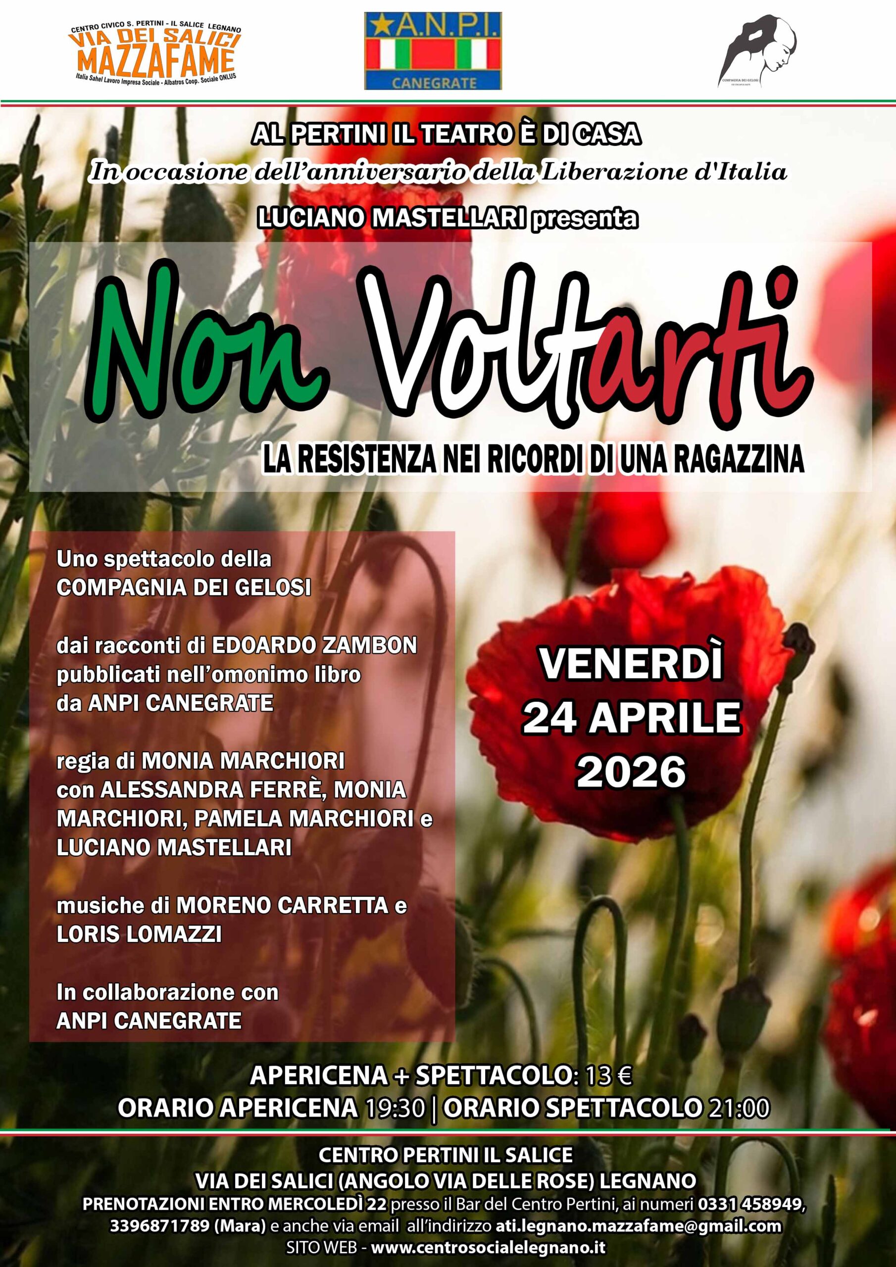 In occasione dell’anniversario della Liberazione d’Italia, il teatro torna protagonista negli spazi del Centro Civico S. Pertini – Il Salice di Legnano. Venerdì 24 aprile, Luciano Mastellari presenta lo spettacolo “Non Voltarti – La Resistenza nei ricordi di una ragazzina”, un’opera intensa che intreccia la grande storia nazionale con una narrazione intima e toccante.