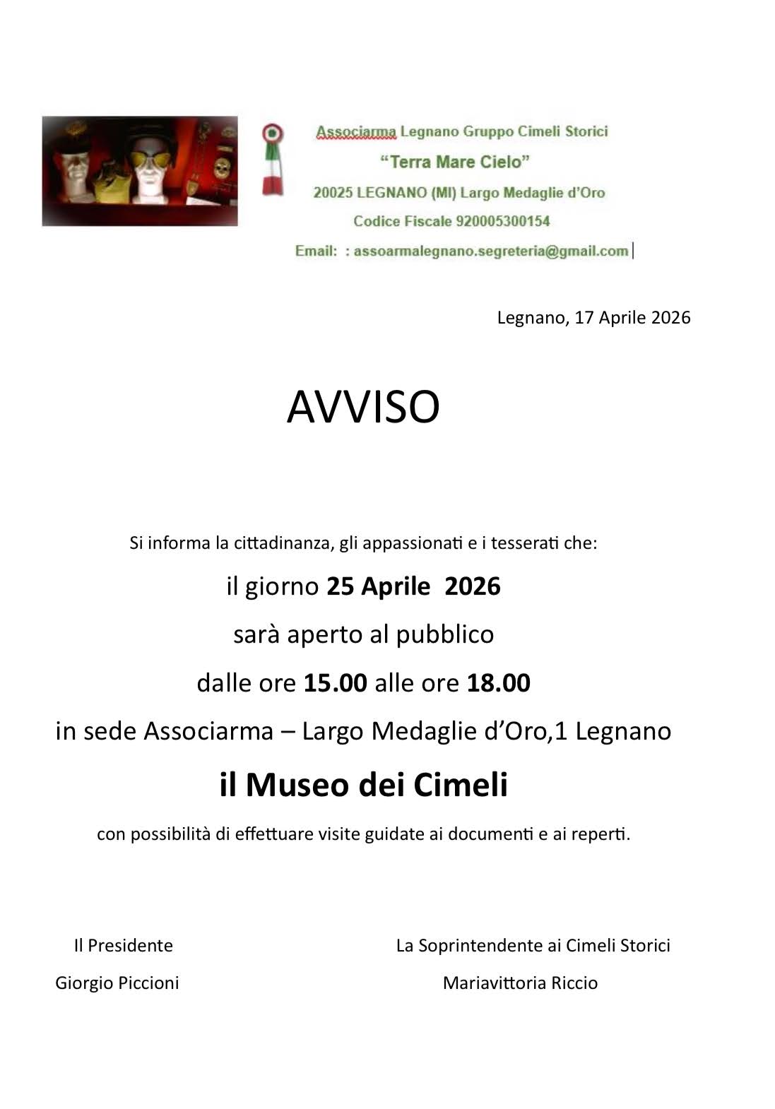 Il Museo dei Cimeli di Legnano sarà aperto al pubblico il 25 aprile. L’iniziativa è promossa da Associarma Legnano Gruppo Cimeli Storici “Terra Mare Cielo” nella sede di largo Medaglie d’Oro. L’apertura riguarda il Museo dei Cimeli gestito da Associarma Legnano, realtà attiva nella conservazione di documenti e reperti storici. Durante il pomeriggio sarà possibile accedere agli spazi espositivi e partecipare a visite guidate dedicate ai materiali custoditi.