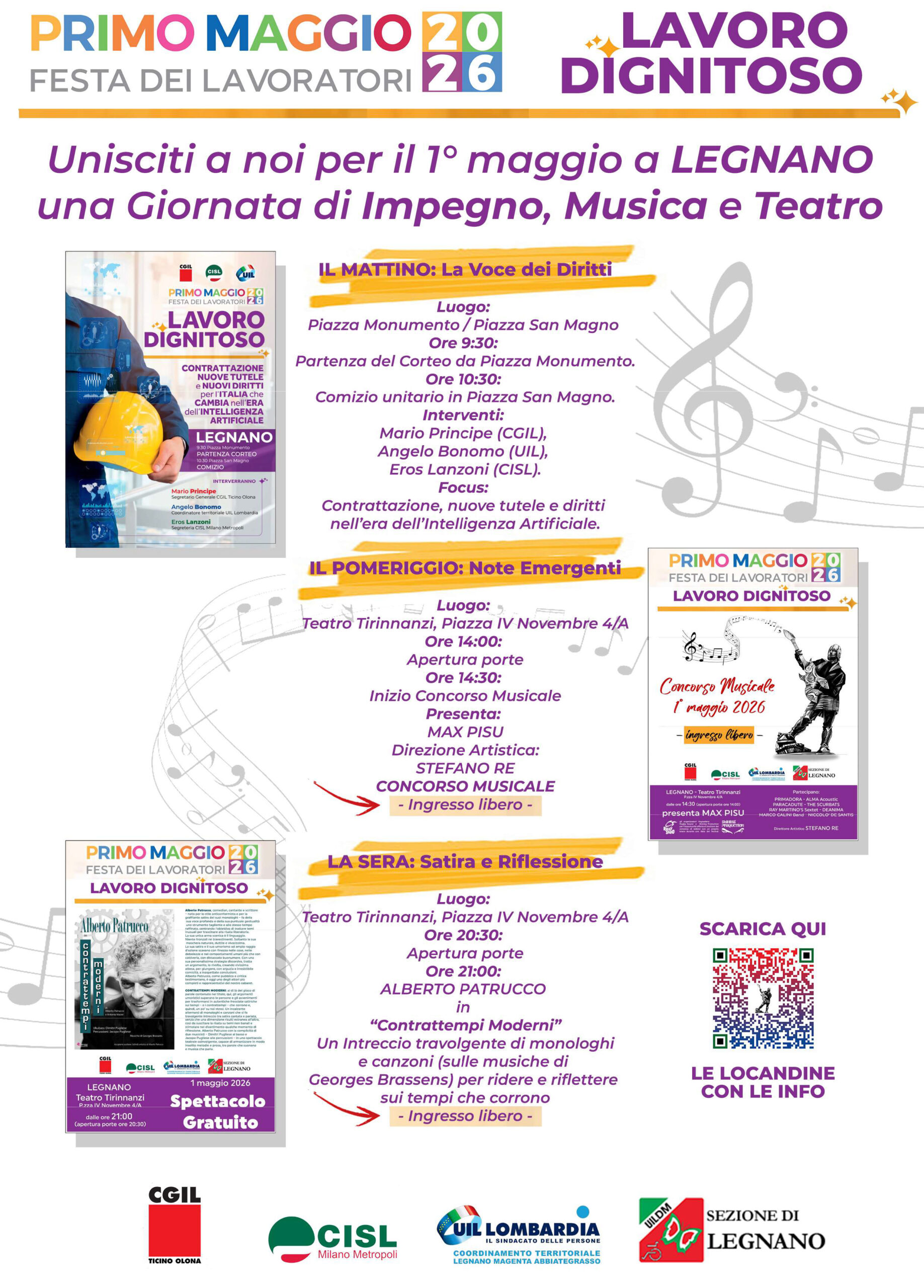 Il Primo Maggio 2026 a Legnano prevede corteo, comizio, concorso musicale al Teatro Tirinnanzi e spettacolo serale con Alberto Patrucco, tutti a ingresso libero