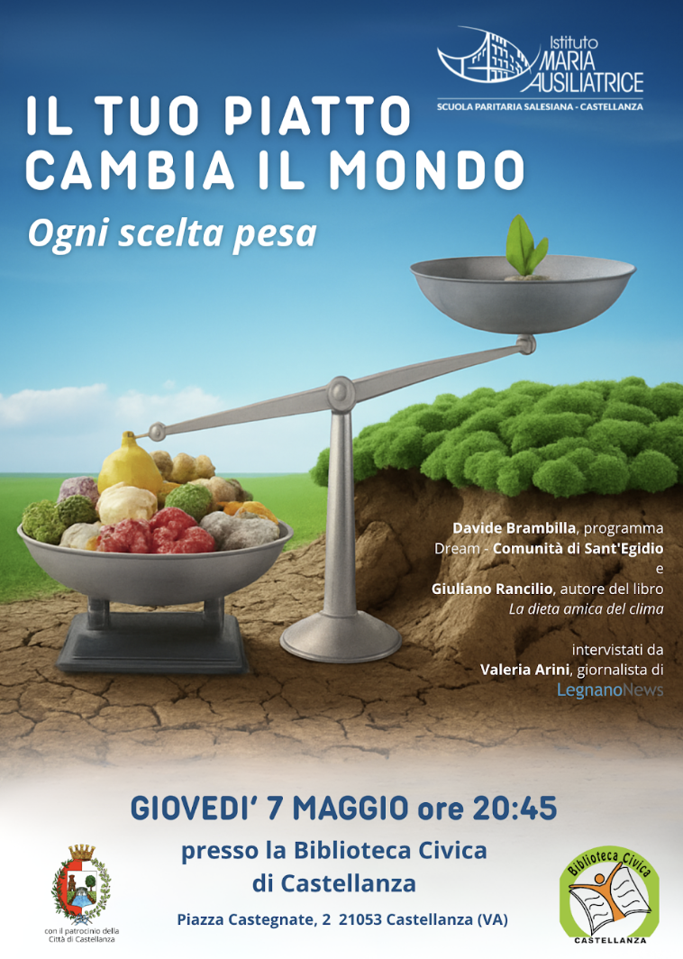 L’appuntamento conclusivo di questa rassegna è fissato per giovedì 7 maggio alle ore 20:45 presso la Biblioteca Civica di Castellanza, una serata nella quale si parlerà soprattutto di come la nostra alimentazione possa aiutare il nostro pianeta. La serata “Il tuo piatto cambia il mondo. Ogni scelta pesa” sarà un dialogo con Davide Brambilla, biologo impegnato nel progetto Dream della Comunità di Sant’Egidio e con Giuliano Rancilio, ricercatore e docente presso il Politecnico di Milano, autore del libro La dieta amica del clima. Una piccola rivoluzione collettiva nella lista della spesa. A intervistarli e moderare la serata ci sarà la giornalista di Legnanonews Valeria Arini.