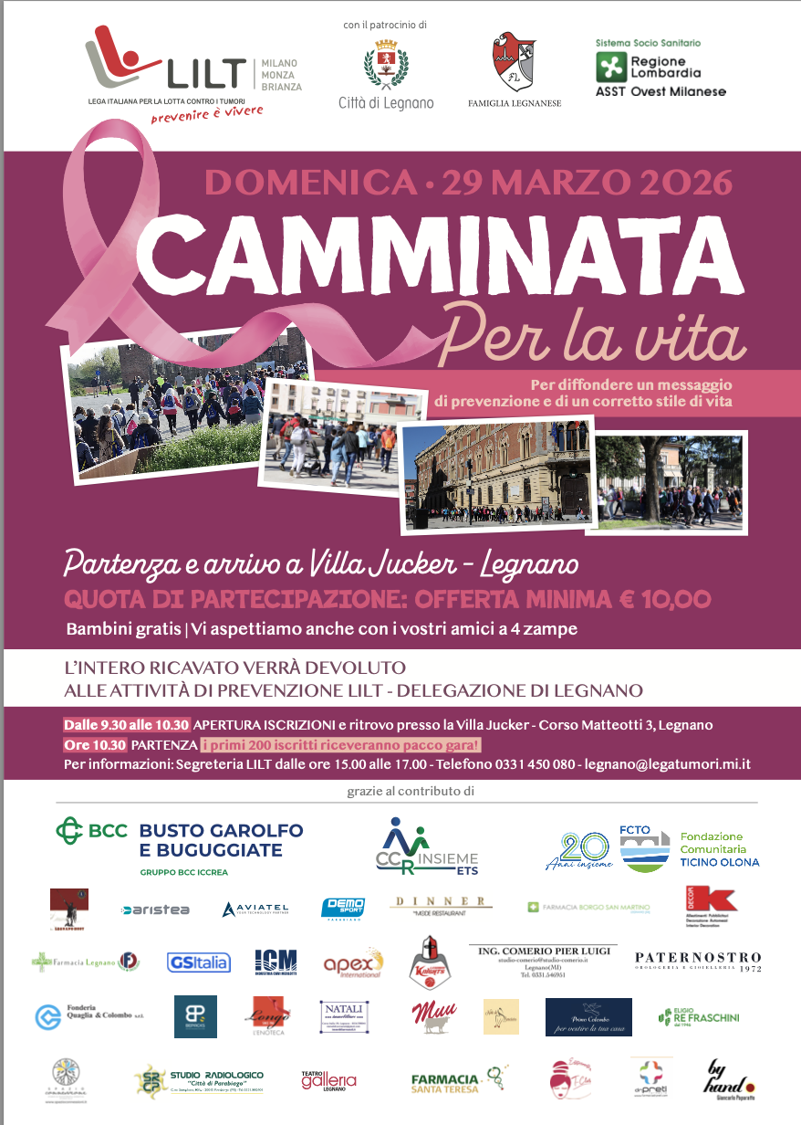 L’evento è patrocinato dal Comune di Legnano ed è reso possibile grazie al sostegno di numerosi sponsor, tra cui la Fondazione Comunitaria Ticino Olona, la BCC di Busto Garolfo e Buguggiate e CCR Insieme ETS, partner storici dell’iniziativa e attivi nella promozione della cultura della prevenzione sul territorio.