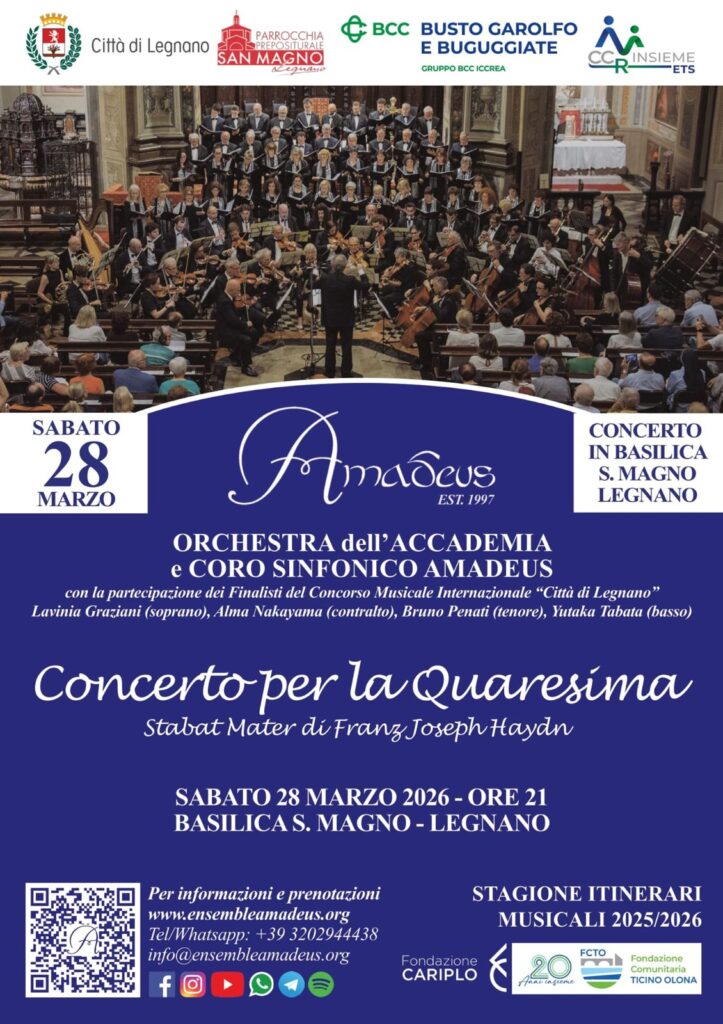 Sabato 28 marzo alle 21 la Basilica di San Magno di Legnano ospiterà un grande concerto quaresimale dedicato allo Stabat Mater di Franz Joseph Haydn. Sul palco un imponente organico di oltre cento musicisti tra coro, orchestra e solisti, per un evento di alto valore artistico e spirituale. Protagonisti della serata saranno il Coro Sinfonico e l’Orchestra dell’Accademia Amadeus, diretti dal maestro Marco Raimondi, con la partecipazione di quattro giovani solisti internazionali. Il concerto è realizzato con il patrocinio della Città di Legnano nell’ambito della stagione “Itinerari Musicali 2025/2026”, con il sostegno della Bcc di Busto Garolfo e Buguggiate e di Ccr Insieme Ets, e con l’ospitalità della parrocchia di San Magno.