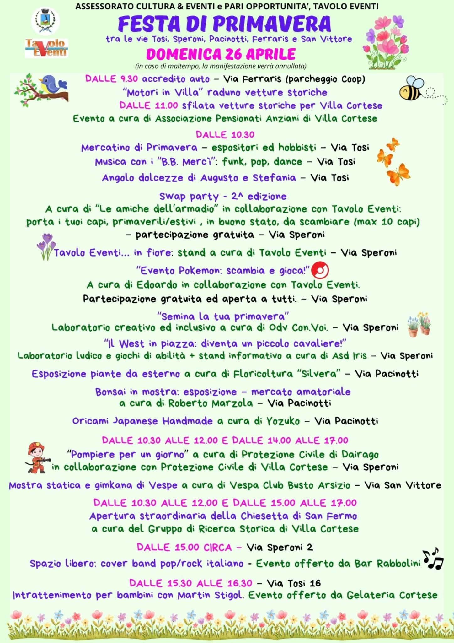 Il momento centrale della Festa di Primavera 2026 a Villa Cortese è domenica 26 aprile, con iniziative diffuse tra le vie tosi, speroni, pacinotti, ferraris e san vittore. Dalle 9.30 in via ferraris è previsto l’accredito per il raduno di vetture storiche “Motori in Villa”, seguito dalla sfilata alle 11.30. Dalle 10.30 partono le attività lungo le vie cittadine con il mercatino di primavera in via tosi, accompagnato dalla musica dei “B.B. Mercì” e da uno spazio dedicato alle dolcezze. In via speroni si svolgono lo swap party, laboratori creativi, attività ludiche per bambini e ragazzi e un evento dedicato ai Pokémon. In via pacinotti trovano spazio esposizioni di piante, bonsai e creazioni artigianali, oltre allo stand Airc con vendita di prodotti. Durante la giornata sono previste anche attività a orari definiti, come “Pompiere per un giorno” e la mostra con gimkana di Vespe tra mattina e pomeriggio, oltre all’apertura della chiesetta di san fermo. Nel pomeriggio, dalle 15.00 circa, musica dal vivo in via speroni, mentre alle 15.30 è previsto intrattenimento per bambini in via tosi. In caso di maltempo la manifestazione del 26 aprile sarà annullata.