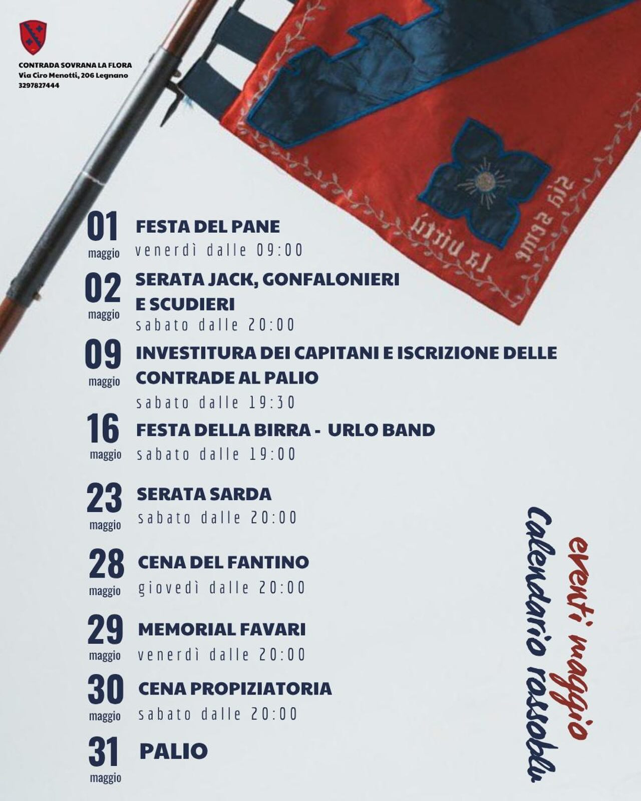 Un calendario di eventi accompagna il mese di maggio della contrada La Flora a Legnano, con iniziative in programma al Cascinone nel rione Mazzafame a Legnano. Un percorso che conduce fino al Palio di Legnano, ossia all’ultima domenica del mese. Il mese di maggio rappresenta il periodo centrale per la vita di contrada, scandito da appuntamenti ricchi di emozioni. I contradaioli rossoblu hanno quindi proposto un ricco calendario che alterna momenti conviviali, tradizionali e istituzionali. Tutti gli eventi si svolgeranno al Cascinone, maniero della contrada La Flora in via Ciro Menotti 206 a Legnano, con orari variabili tra mattino e sera a seconda delle iniziative.