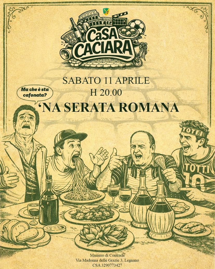 Sabato 11 aprile, alle 20 la contrada Sant’Ambrogio di Legnano ospiterà una serata all’insegna della cucina e della cultura romana. “Na Serata Romana” offrirà un’esperienza gastronomica unica con piatti tipici della tradizione romana, da gustare in un’atmosfera conviviale e allegra.