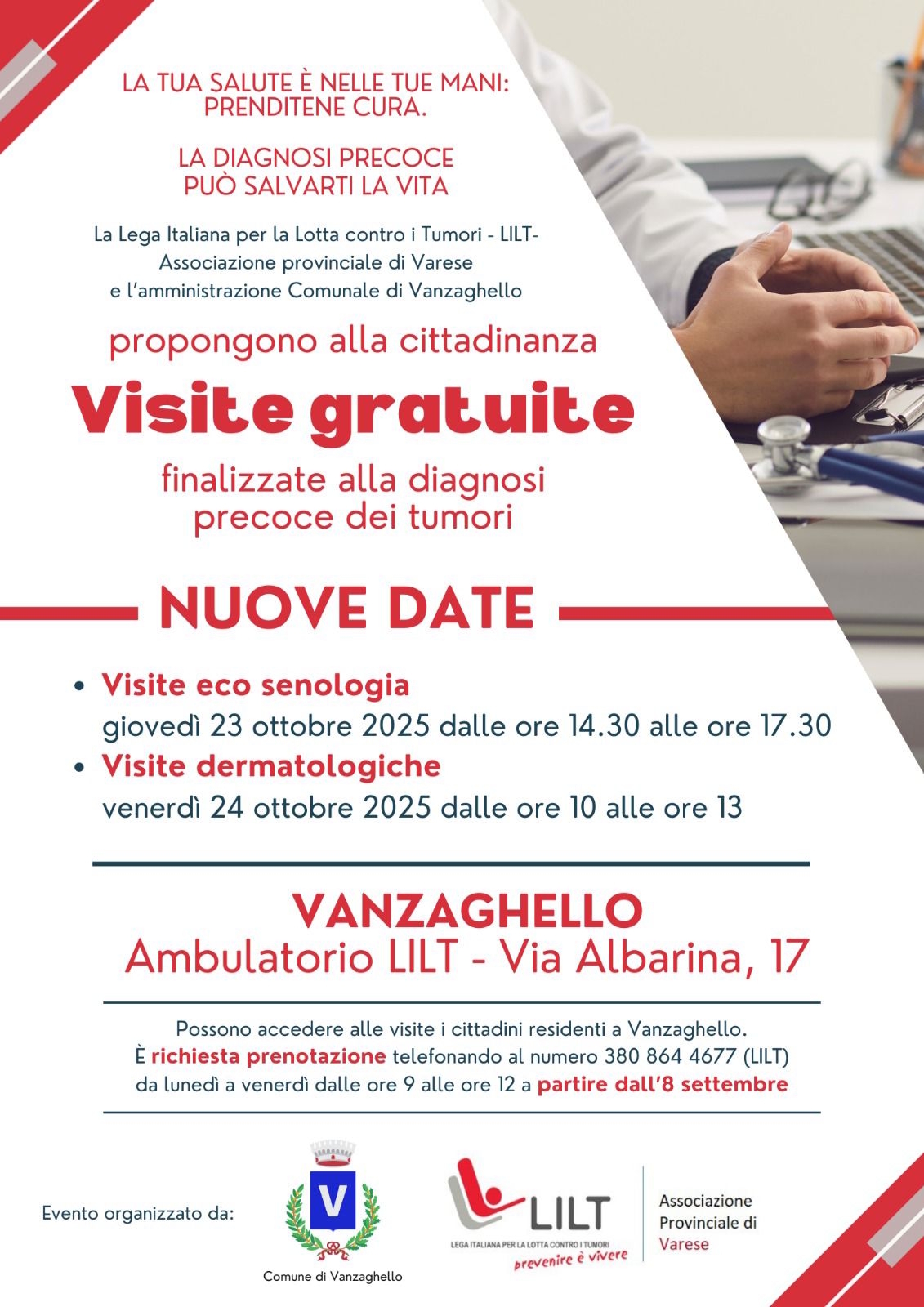 La diagnosi precoce può salvare la vita. A Vanzaghello riprendono le visite gratuite per la prevenzione dei tumori, rivolte ai cittadini residenti, grazie alla collaborazione tra LILT – Lega Italiana per la Lotta contro i Tumori (associazione Provinciale di Varese) e l’amministrazione comunale. Le nuove date confermate sono giovedì 23 ottobre, con visite eco senologiche dalle 14.30 alle 17.30, e venerdì 24 ottobre 2025, con visite dermatologiche dalle 10.00 alle 13.00. Gli appuntamenti si svolgono presso l’ambulatorio LILT all’interno del Centro Salute “Ambrosetti Calloni”, in via Albarina 17 a Vanzaghello. Possono accedere alle visite gratuite tutti i cittadini residenti a Vanzaghello. È obbligatoria la prenotazione telefonica al numero 380 8644677 (LILT), attivo dal lunedì al venerdì, dalle 9.00 alle 12.00, a partire da lunedì 8 settembre.