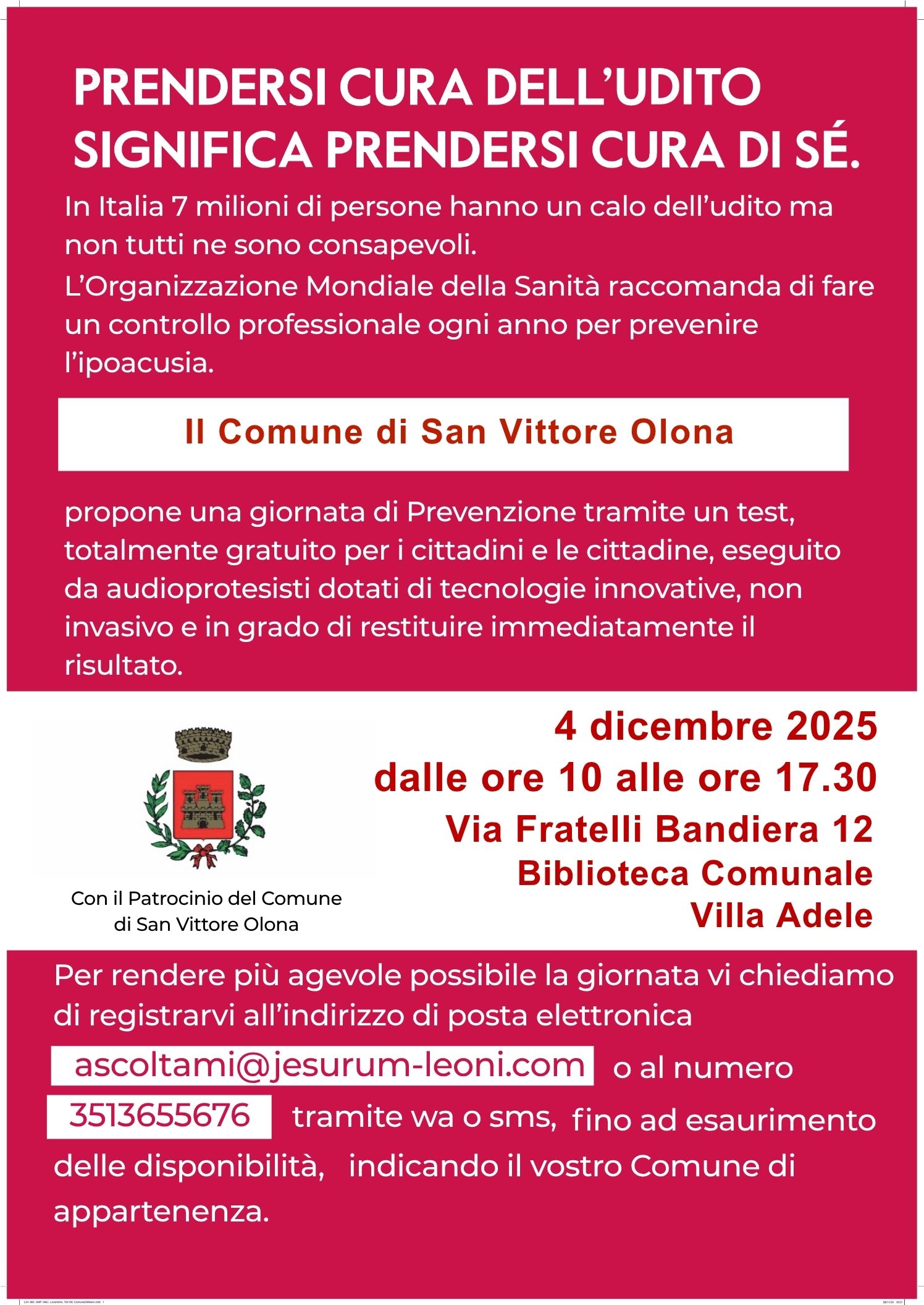 Sensibilizzare sulla salute uditiva e offrire un servizio concreto ai cittadini: è questo l’obiettivo della giornata gratuita di prevenzione dell’udito organizzata dal Comune di San Vittore Olona per giovedì 4 dicembre con il patrocinio dell’Organizzazione Mondiale della Sanità. Dalle 10 alle 17.30, nella biblioteca comunale Villa Adele in via fratelli Bandiera 12, sarà possibile sottoporsi a un test dell’udito professionale, eseguito da audioprotesisti qualificati. Il controllo sarà totalmente gratuito, non invasivo e grazie a tecnologie innovative restituirà il risultato in tempo reale. Per agevolare l’organizzazione e garantire a tutti l’accesso, è richiesta la registrazione via email all’indirizzo ascoltami@jesurum-leoni.com, oppure via WhatsApp o SMS al numero 351 3655676, indicando il proprio Comune di appartenenza. Le visite verranno effettuate fino a esaurimento disponibilità.4