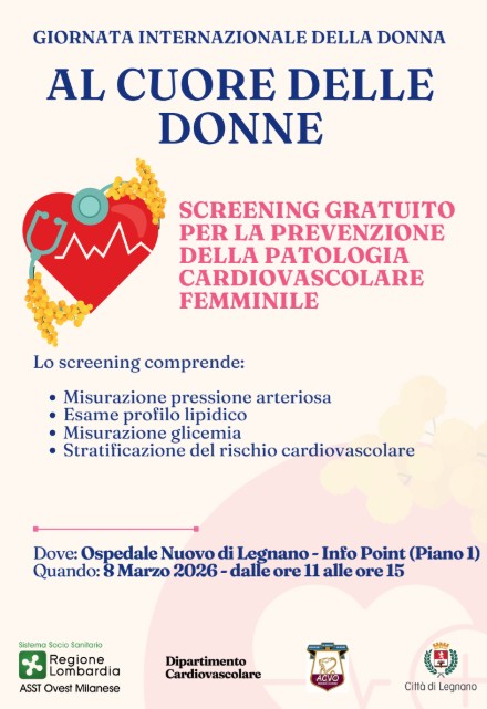 Uno screening cardiologico gratuito a Legnano per la prevenzione cardiovascolare femminile. In occasione della Giornata internazionale della donna, il Dipartimento Cardiovascolare dell’ASST Ovest Milanese promuove l’iniziativa “Al cuore delle donne”. L’appuntamento è in programma domenica 8 marzo, dalle 11 alle 15, all’Info Point al piano 1 dell’ospedale nuovo di Legnano. L’iniziativa è dedicata alla sensibilizzazione, informazione e prevenzione delle patologie cardiovascolari nella popolazione femminile. Durante l’evento sarà possibile partecipare a uno screening cardiologico gratuito. I controlli previsti includono la misurazione della pressione arteriosa, l’esame del profilo lipidico, la misurazione della glicemia e la valutazione del rischio cardiovascolare. Le partecipanti potranno inoltre effettuare un colloquio informativo con il cardiologo presente, con l’obiettivo di ricevere indicazioni personalizzate e chiarimenti sui risultati delle misurazioni effettuate.