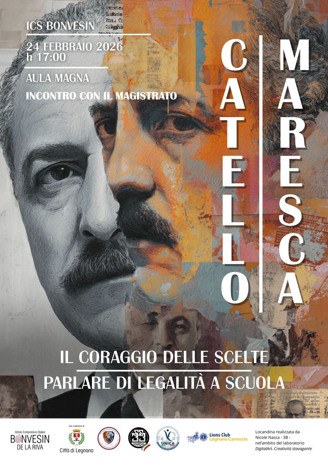 L’iniziativa vede il patrocinio della Città di Legnano e il coinvolgimento di realtà associative del territorio, tra cui il Lions Club Legnano Carroccio. Il magistrato noto per il suo lavoro in ambito antimafia dialogherà con il pubblico sul significato delle scelte individuali, sull’importanza della coerenza e sul valore della legalità come fondamento della convivenza civile. Un tema particolarmente significativo in ambito scolastico, dove la formazione alla cittadinanza attiva rappresenta un tassello centrale del percorso educativo. Di seguito la locandina informativa dell’evento realizzata da Nicole Nasa (3B) nell’ambito del laboratorio DigitalArt. Creatività stravagante dell’Istituto Bonvesin.